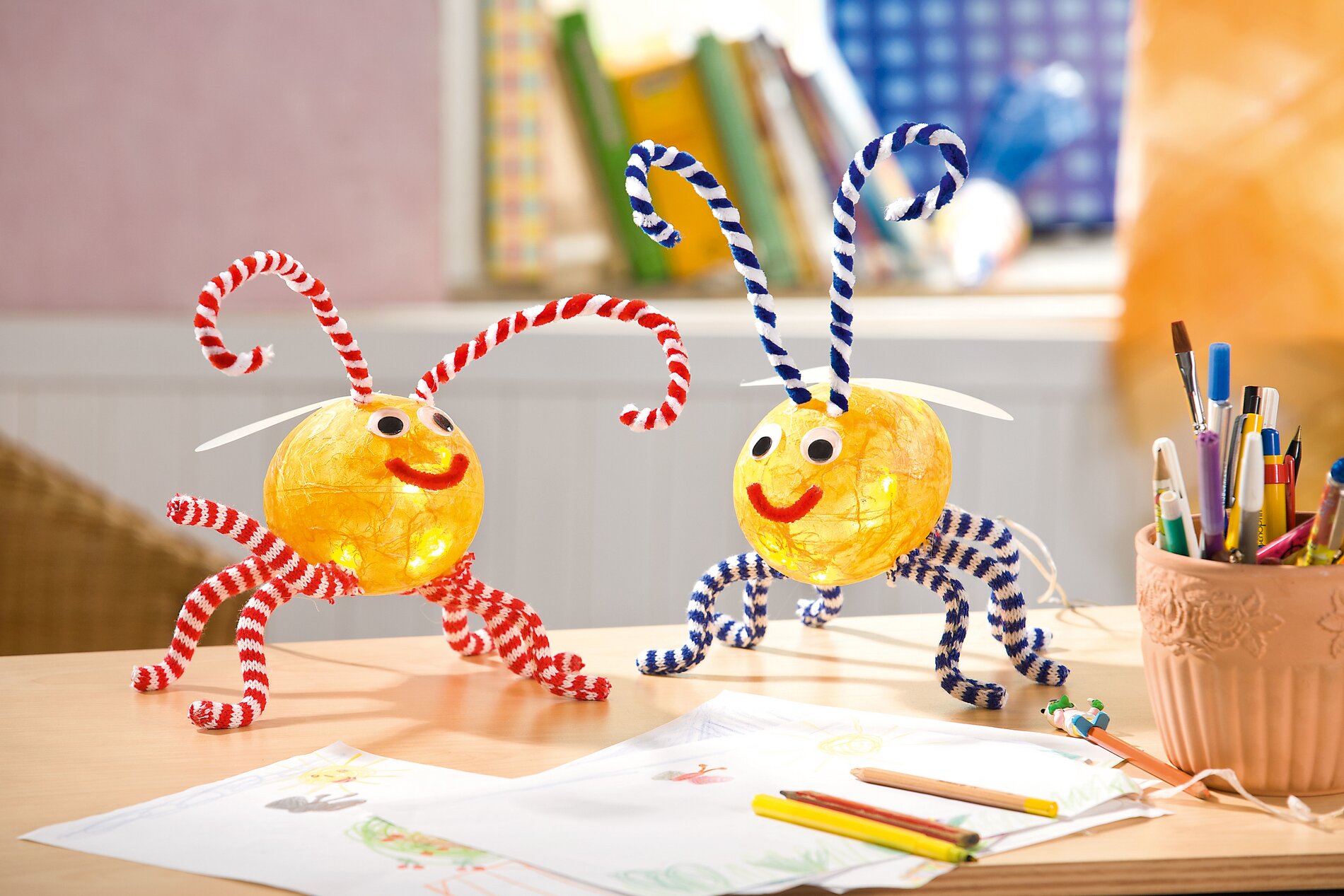Jetzt brauchen die Glühwürmchen nur noch Flügel und ein Gesicht. Die Flügel schneidest du mit Hilfe der Vorlage aus Lampenfolie aus, den Mund biegst du aus einem Stück Chenilledraht. Jetzt nur noch Flügel, Mund und Augen aufkleben und fertig sind deine tollen Glühwürmchen.