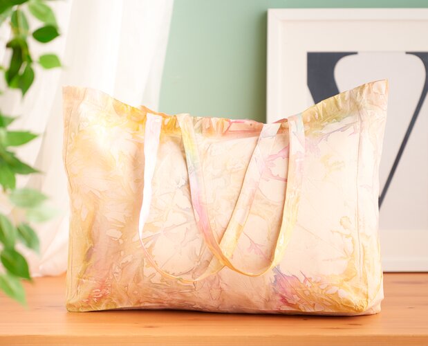 Dip-Dye-Technik. Hierfür gibst du 1 Liter kaltes Wasser in eine alte Wanne oder ein Gefäß und gibst zwei volle Verschlusskappen der Textilfarbe in das Wasser. Dann legst du die Hälfte des nassen Stoffes in das Farbbad. Nun zieht sich das gefärbte Wasser langsam von unten in die Textilfasern und wandert nach oben. So entsteht ein schöner Farbverlauf. Sobald die gewünschte Farbintensität erreicht ist, nimmst du den Beutel aus dem Wasserbad und lässt ihn trocknen. Anschließend bügelst du.