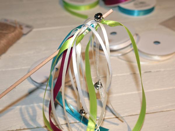Jeweils eins der breiten Satinbänder am Stab festkleben. Dann von den dünnen weißen und cremefarbenen Bändern mehrere anknoten. Zwei Schellen auf das Organzaband schieben, verknoten und frei hängend festbinden.