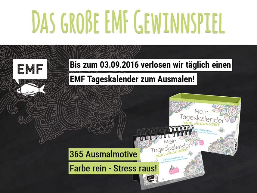 Ab heute verlosen wir 14 Tage lang jeden Tag einen tollen Tageskalender zum Ausmalen von EMF. 365 verschiedene Motive sorgen nicht nur täglich für Abwechslung, sondern auch Entspannung und Inspiration.
