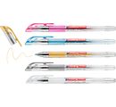 Schönes edding Gelroller metallic 2185 5er-Set. Die metallgefasste Rollspitze hat eine Stichstärke von 0,7 mm. Diese Gelroller verfügen über eine spezielle Geltinte auf Wasserbasis zum besonders präzisen und weichen Schreiben. Das Set enthält die Farben Weiß, Gold, Silber, Dunkelbalu-metallic und Pink-metallic.