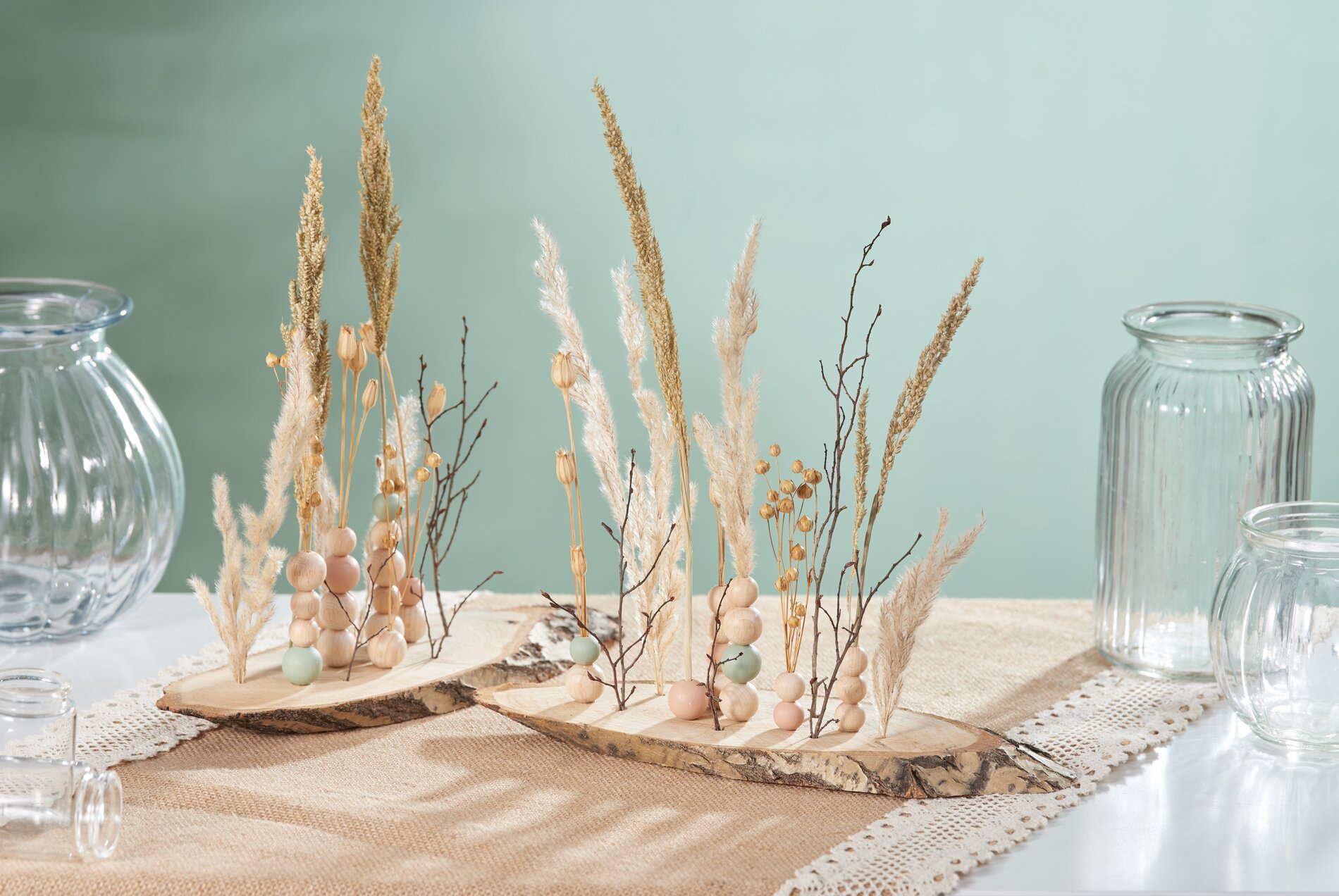 Drill holes in the tree discs, e.g. with a Dremel drill, for branches and dried flowers. Fix them in the holes, if necessary with a little glue. If necessary, lightly mark the places where the balls are to be placed.