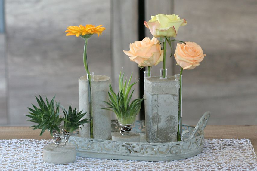 Da Kreativbeton recht schnell antrocknet, sollten ihr relativ zügig arbeiten. Besonders wenn ihr Reagenzgläser oder die Drahtgestelle für eure Pflanzen reinstecken müsst.