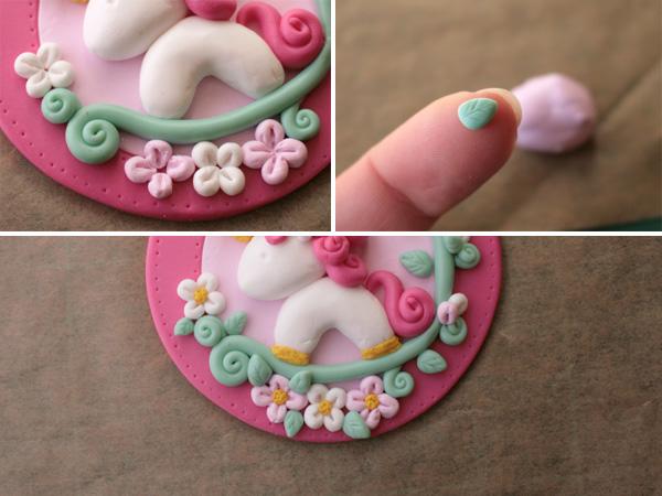 Anschließend kommt die Ranken-Dekoration dran. Die einzelnen Elemente formt ihr genauso wie die Haare.Zusätzlich aber auch noch eine Größere, die das Einhorn einrahmt. Um die kleineren Elemente besser anpassen zu können, kürzt ihr sie mit einem Messer ein und schiebt sie leicht unter die große Ranke. ![]()