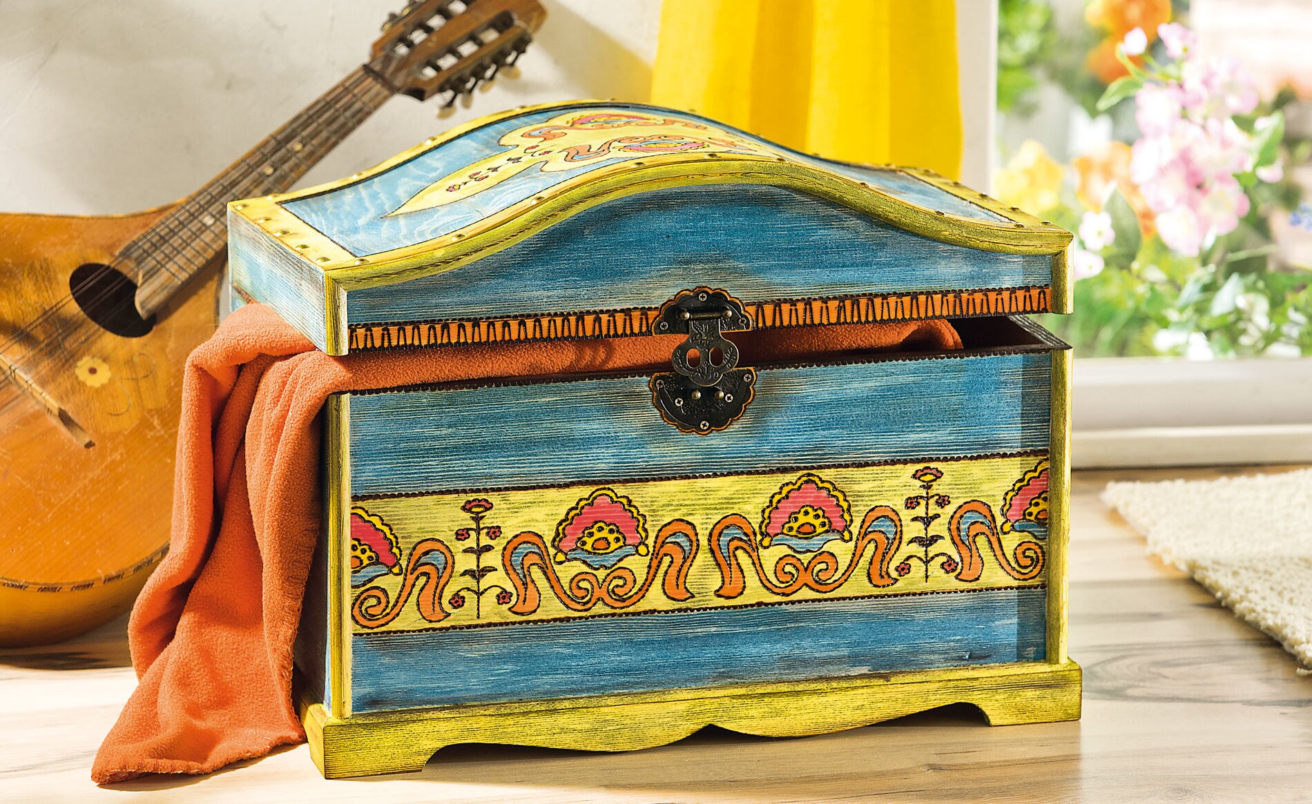 Copy the motif template to the desired size and use graphite paper to transfer the motif to the chest. Put an ornament of individual motifs together on the lid. Draw the motifs with the branding pen.