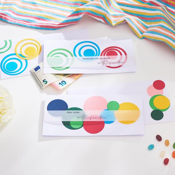 Glue the punched-out circles to the card and envelope using handicraft glue. Play with different arrangements to find the best design. Cut a strip of vellum paper and use the stamp to place a message or motif of your choice on the paper.