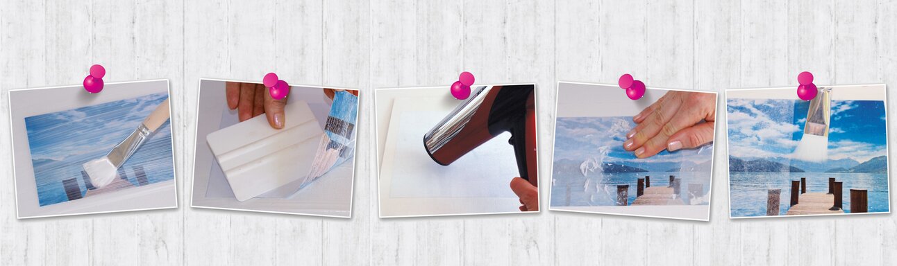 No matter what substrate material you want to use it is important that the surface is as light as possible. With photo transfer, there can always be slight color and contrast losses. In addition, the substrate should be free of dust and grease. If you have chosen wood as the substrate, we recommend that you sand the surface beforehand. The smoother the wood surface is, the better the result will be. Furthermore, you can apply a light color in advance if you wish. Next, you need to print your desired motif mirror-inverted in the appropriate size of the background on a laser printer. It is important that you print your design on a laser printer because the colors are not waterproof on an inkjet printer. Otherwise, the colors would run and smudge in contact with moisture, making the designs unusable. Use a brush to apply the transfer medium to the base and front of the photo. Place the coated side of the image on the desired area. It is best to use a ruler to press the image on evenly. The adhesive residues outside the image should be removed immediately with a cloth. In the above step, you need to work quickly so that nothing dries, because the photo quickly soaks and thus the optimal adhesive strength is lost. Then blow dry for 10 minutes on the highest setting and then let it cool well or let it dry for 24 hours at room temperature. After the drying time, moisten the paper layer with water and wait briefly until the paper has softened. Then rub away the paper layer with your fingers or with a soft sponge until only individual fibers are visible. What remains is the waterproof ink embedded in the Foto Transfer Potch. Finally, cleanly overcoat everything again with Foto Transfer Potch Overcoat; this will make the fine white paper residue disappear. The overcoat makes the colors of the image even more brilliant and gives the image even more depth. Furthermore, the overcoat helps prevent yellowing, dust, dirt and is waterproof at the same time.
