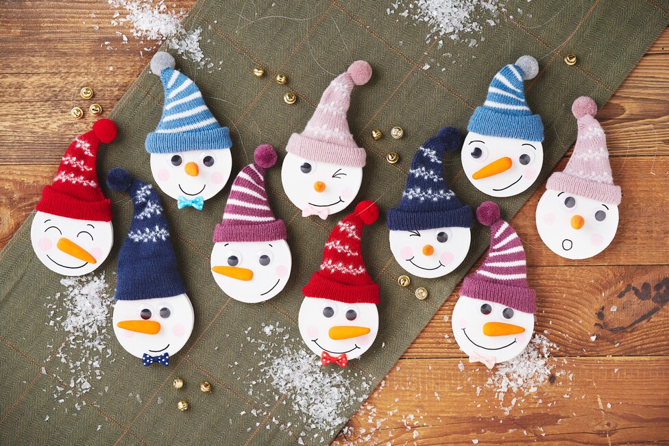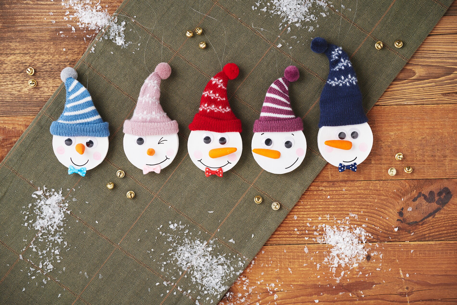 4. Design the faces Now it's time to get creative: design the faces of your snowman pendants. You can stick on wobbly eyes or paint on closed eyes with a thin brush. A winking eye gives your snowman a mischievous expression.