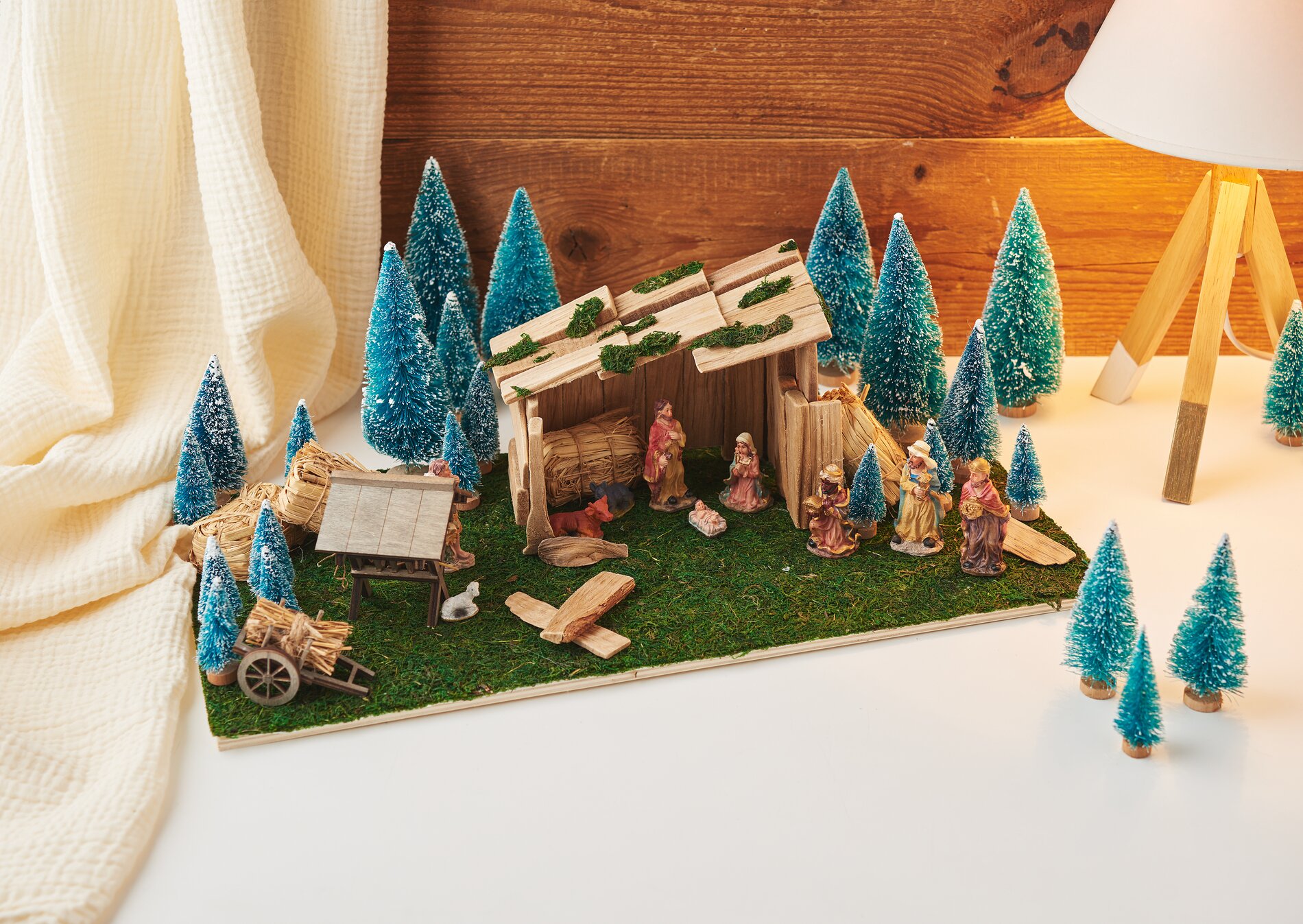 Once your crib structure is in place, you can start attaching the decorative elements. Now glue the christmas crib, straw cart, the manger, the bale of straw and the fir trees in the desired places. There are no limits to your imagination here - design the landscape to your taste. Then place the figures to bring the scene to life.