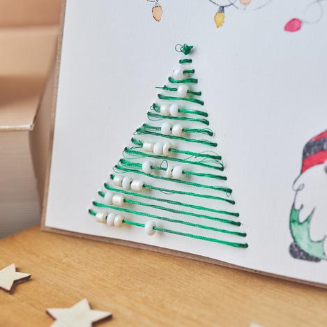 Now comes the centrepiece of your card - the embroidery! Take embroidery twist (also known as embroidery yarn) and a needle. Embroider the contours of the motifs. For additional accents, you can work with sparkling rocaille beads that you thread onto the yarn.