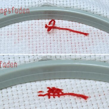 Then stretch the fabric in the embroidery ring so that it is as tight as possible. Then cut a piece of the embroidery twist in the desired colour and divide it so that you have 3 threads twice. Your pieces of thread should be no longer than twice the length of your arm so that you can still work easily.