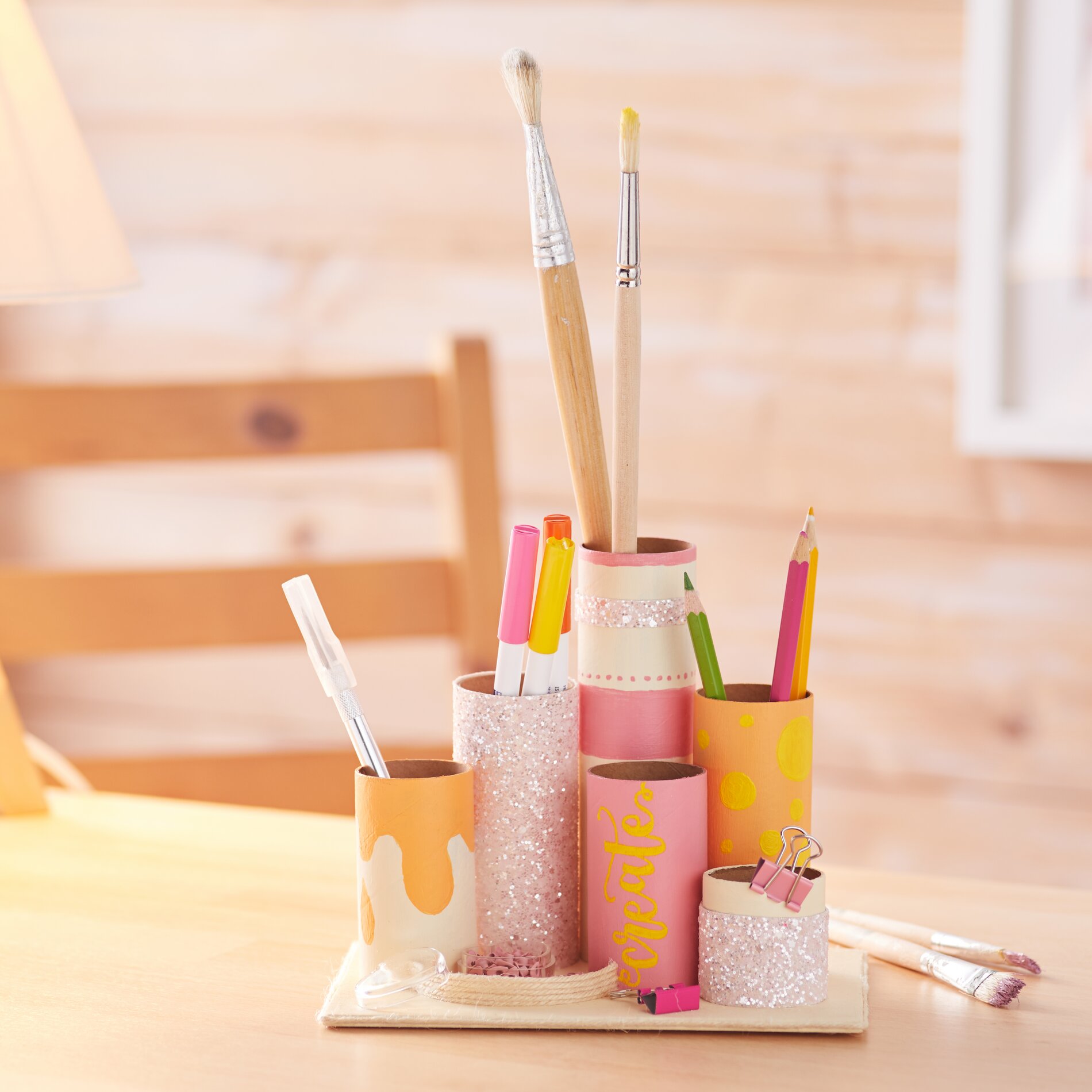 The pen box shows how practical and decorative craft projects can be. The sunny glitter look brings a good mood on the desk.