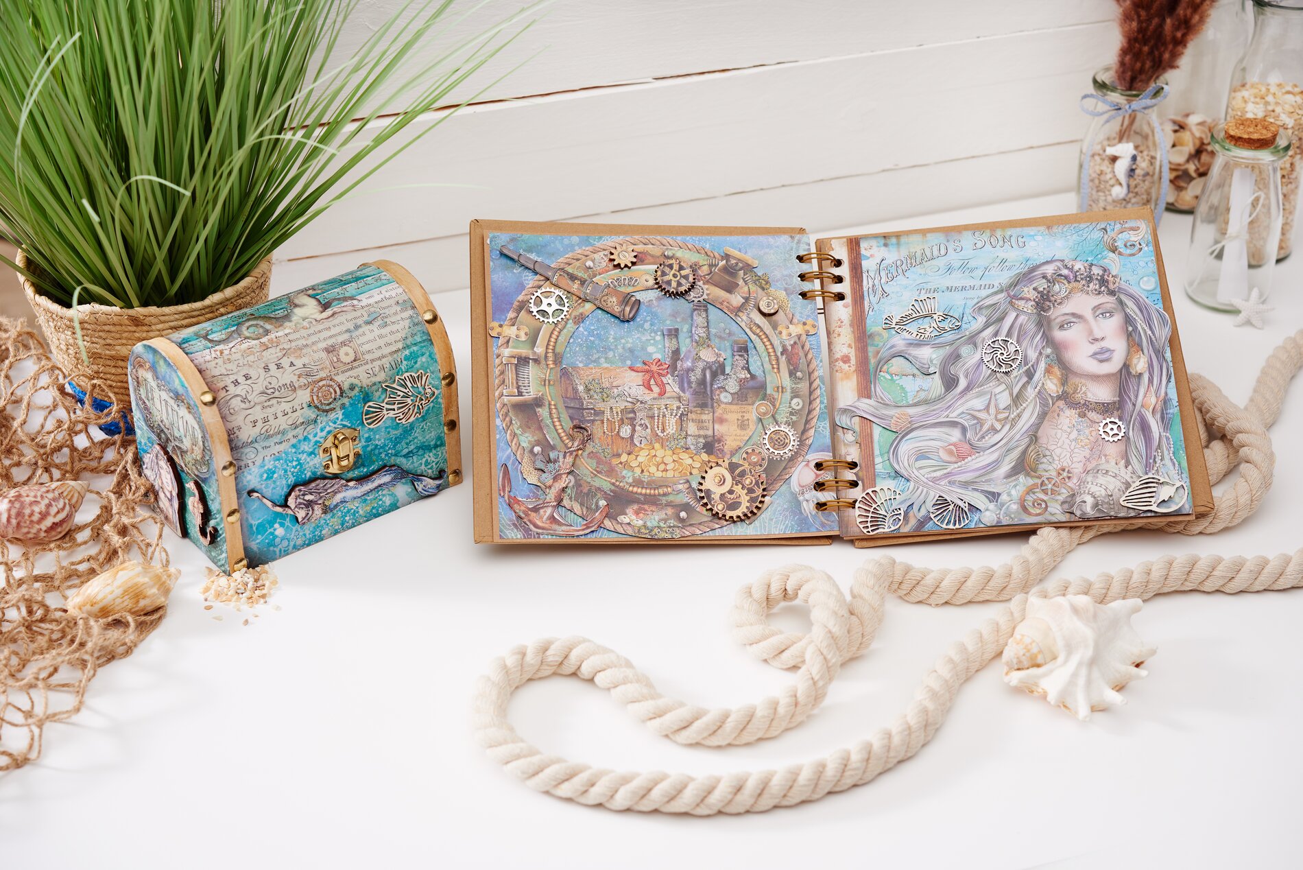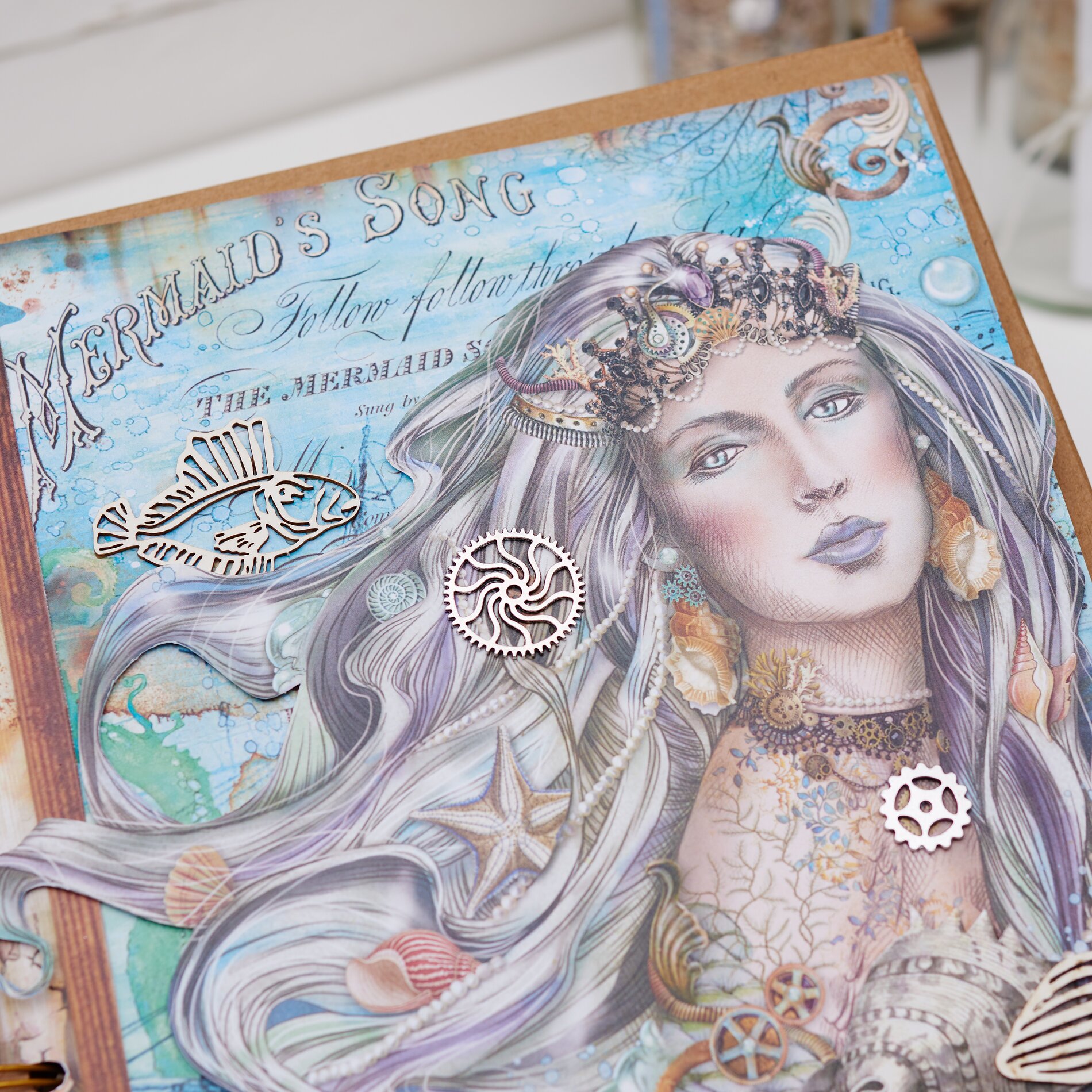 Cut out motifs from the scrapbook block "Songs of the Sea" and attach them with VBS handicraft glue, spacer tape or 3-D glue pads into the album.