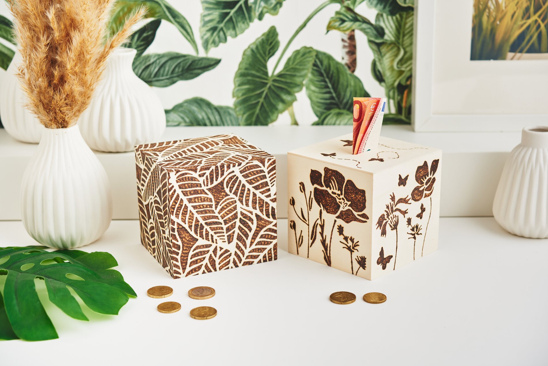 With a wooden money box and wooden burning , you can create a unique, individual piece in no time at all. Whether as a personal gift, for children or as a decorative highlight in your own home - wooden burning turns a plain wooden money box into a truly unique piece. In these instructions, we will show you step by step how to use a stencil and a branding pen to transfer your desired motif onto the wood and burn it in permanently. Even without any previous knowledge, this creative DIY-Project very easily.