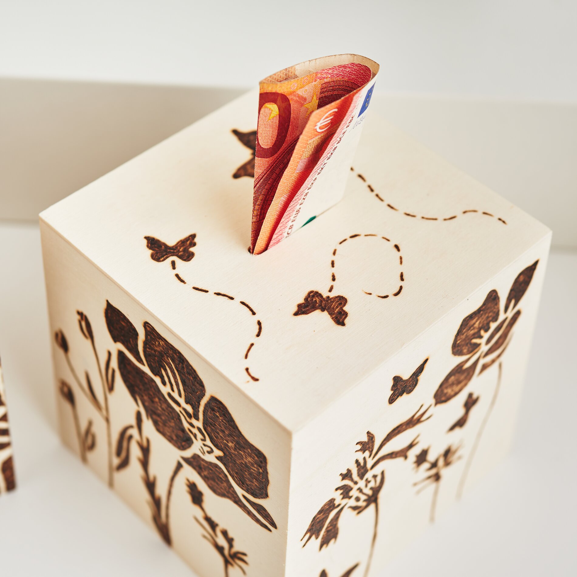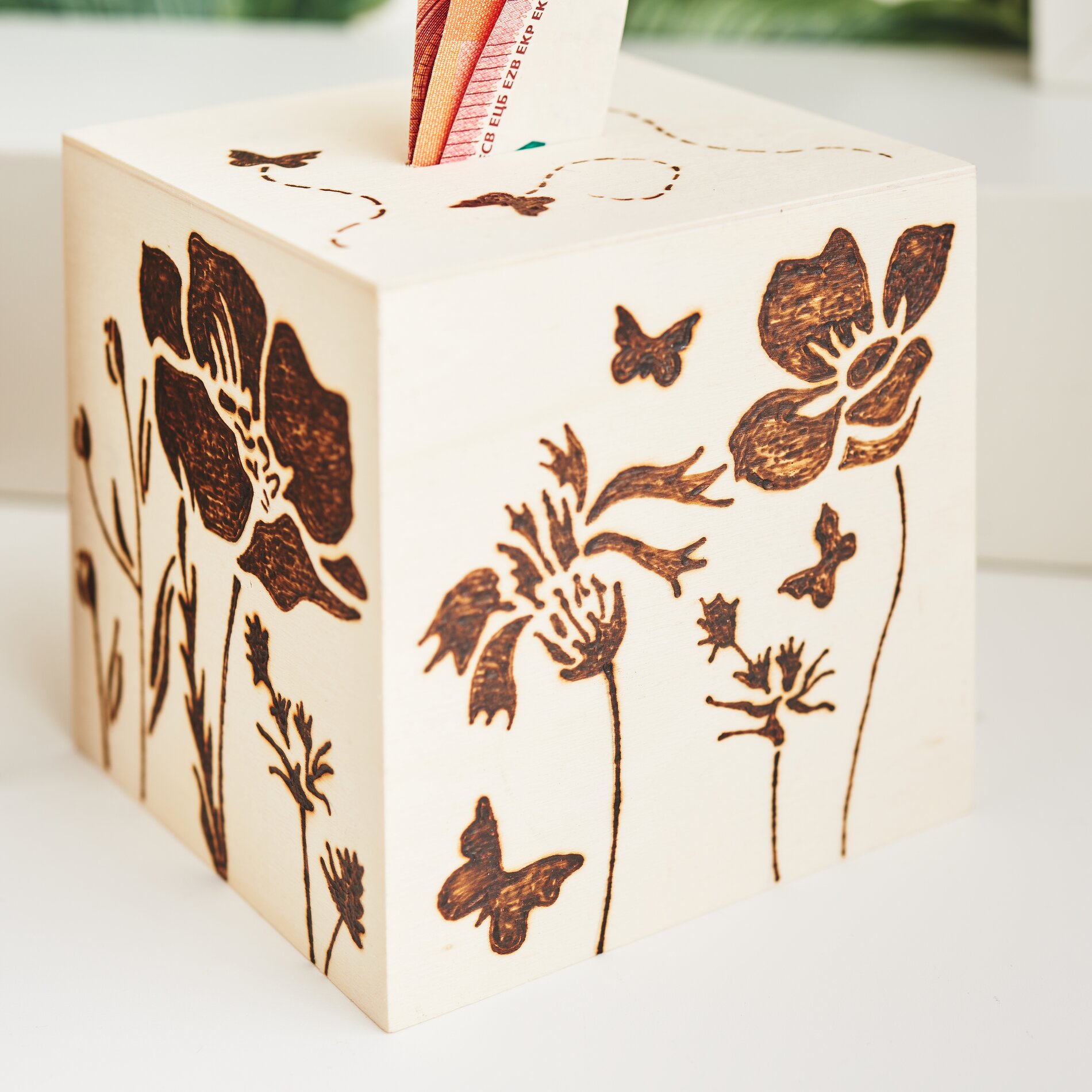 Design your own wooden money box with wooden burning. Discover matching money boxes, stencils and branding tools in our online store and start your next craft project now! Turn wood into a personal work of art - we hope you enjoy creating it!