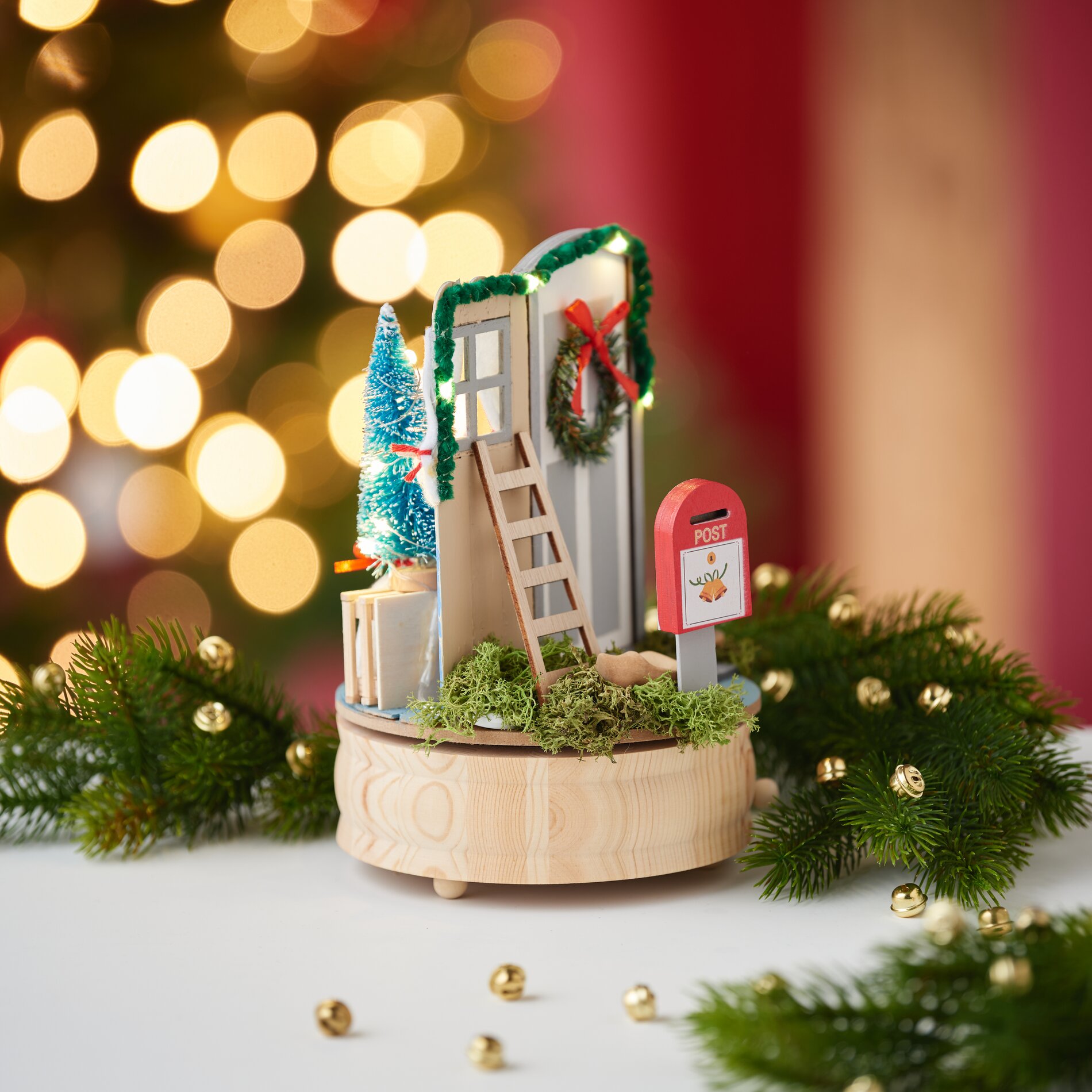 Then attach the door wreath to the Secret Santa door with hot glue. If you stick a small dot of paint straight from the tube directly onto the door, you will get a circle that will make a pretty doorknob.