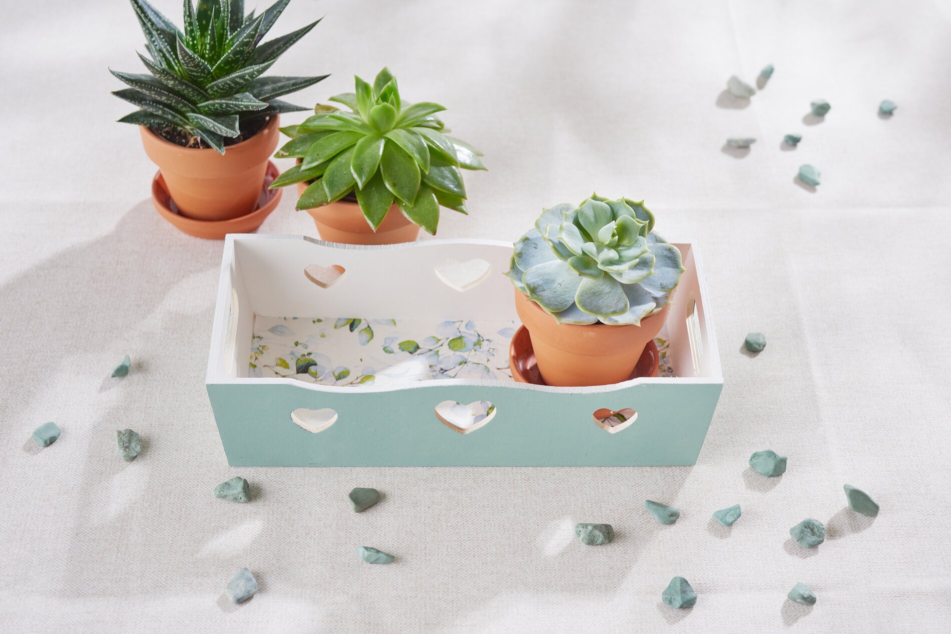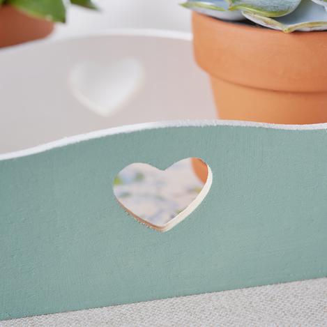 Once the tray is dry, paint the inside surface and the narrow edges of the tray with white paint. The colours of your napkin motif will stand out particularly well on this light background. Use an antique green colour for the outer surfaces. This is ideal for the vintage look. It is best to apply 2 to 3 coats of paint. This will give you good coverage and an even finish. Allow each coat to dry well before applying the next.