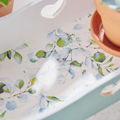 Coat the base of the tray with a thin layer of napkin varnish. This acts as an adhesive and ensures that the napkins adhere well. Then carefully place the cut napkins on the base plate. Make sure that the napkins do not have any folding stars: work from the centre to the edges to avoid air bubbles. Then coat the designed napkin motif again with the varnish for final fixing.