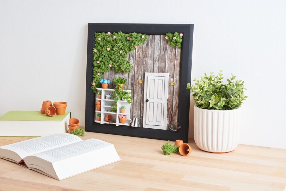 Decorate your artwork with a touch of nature, by sticking some Iceland moss in a corner of the frame with hot glue. Finally, place small gypsophila flowers on the moss. Your picture frame with miniature scene is finished.