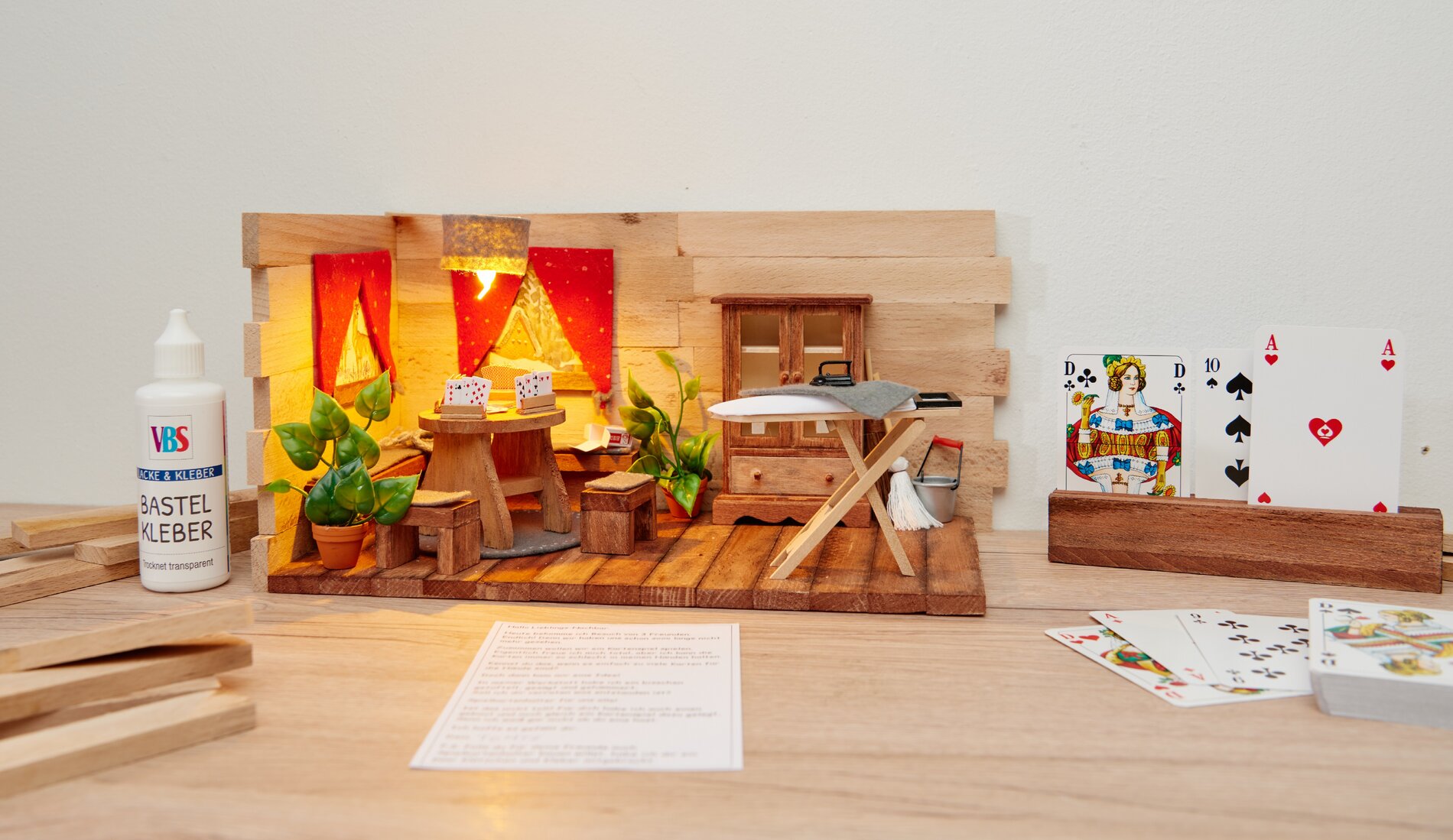 Für das Kind den Kartenhalter, die Spielkarten, Klötzchen, VBS Bastelkleber und den Brief von Tomte dazu legen.