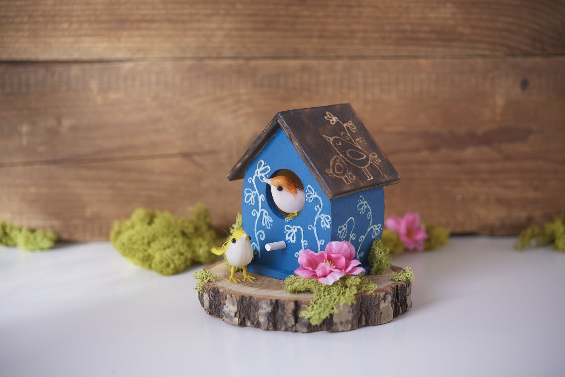 Glue the bird house with hot glue on a tree disc. Finally, you can decorate your bird house with Iceland moss, flowers and birds as you wish.