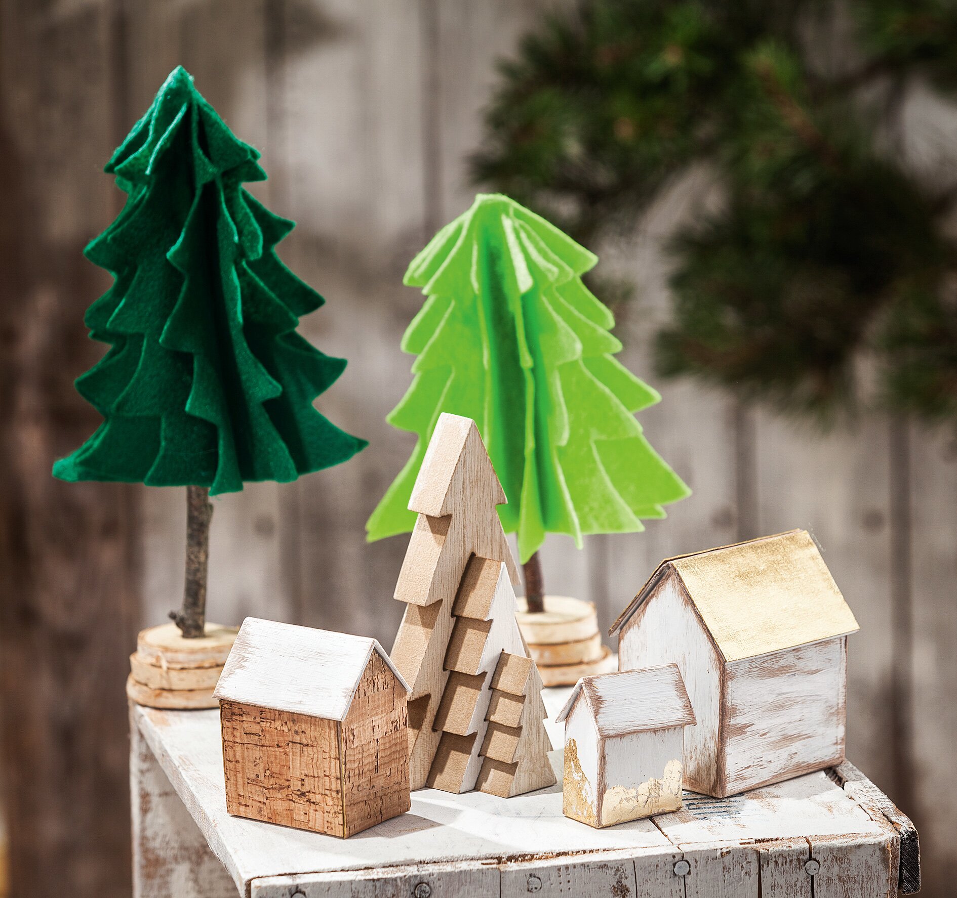 Komplettieren Sie das gestaltete Arrangement der Filzbäume und Häuser-Pappschachteln mit richtigen Holz-Tannenbäumen. Auch dieses Trio kann ganz nach persönlichem Geschmack noch mit Filz oder Farbe verschönert werden.