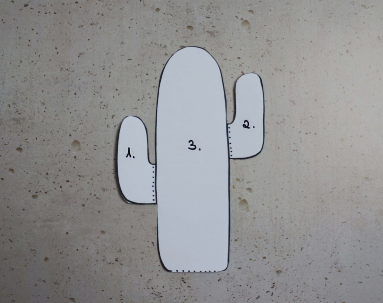 Zu allererst zeichnet ihr euch auf einem Papier eine Schablone für euren Kaktus. Die Zeichnung besteht aus drei Teilen, dem Mittelteil des Kaktus und zwei Armen. Die genaue Größe und Form könnt ihr hierbei frei gestalten.Im Anschluss schneidet ihr diese drei Teile aus, legt sie auf euren Filzstoff und zeichnet sie euch an. Wir benötigen von allen drei Teilen jeweils zwei Ausschnitte, die später zusammengenäht und mit Watte gefüllt werden.Wir haben also nach diesem Schritt 6 einzelne Stoffteile. Diese könnt ihr ganz einfach mit einer Schere ausschneiden.