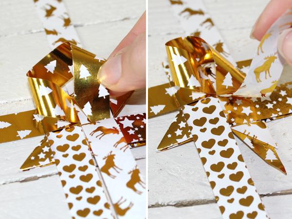 Legt den einen oberen Streifen nach unten (Elch) und verdreht den linken Streifen (Tannenbäume) so wie abgebildet und schiebt ihn dann in die Lasche unter dem Elch-Streifen.