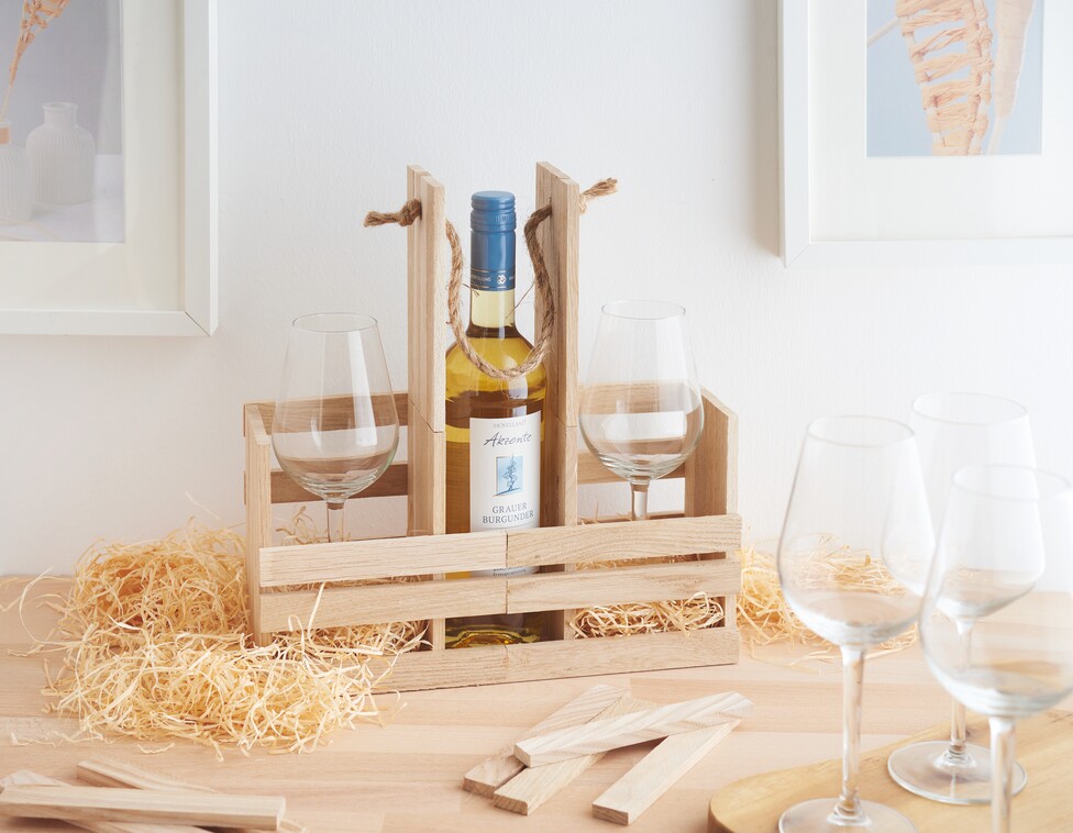 Pour finir, enfilez le cordelette dans les trous des parois latérales centrales et faites un nœud. Vous obtiendrez ainsi une poignée de transport pratique pour votre porte-bouteilles. En option, vous pouvez ajouter laine de bois dans les compartiments à verre pour créer un accroche-regard supplémentaire.