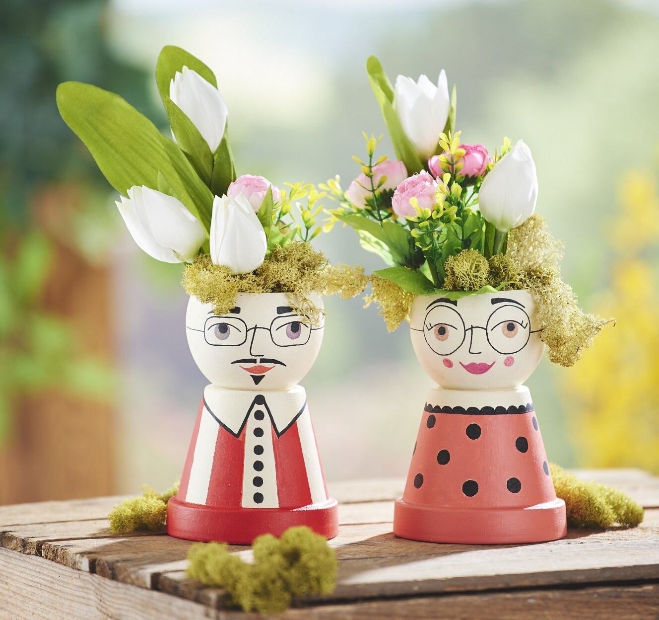 Collez les pots ensemble (1 pot pour la tête et 1 pour le corps). Garnissez le pot des têtes avec des fleurs et de la mousse. Dans notre exemple, nous avons utilisé des fleurs artificielles, plus faciles d'entretien !