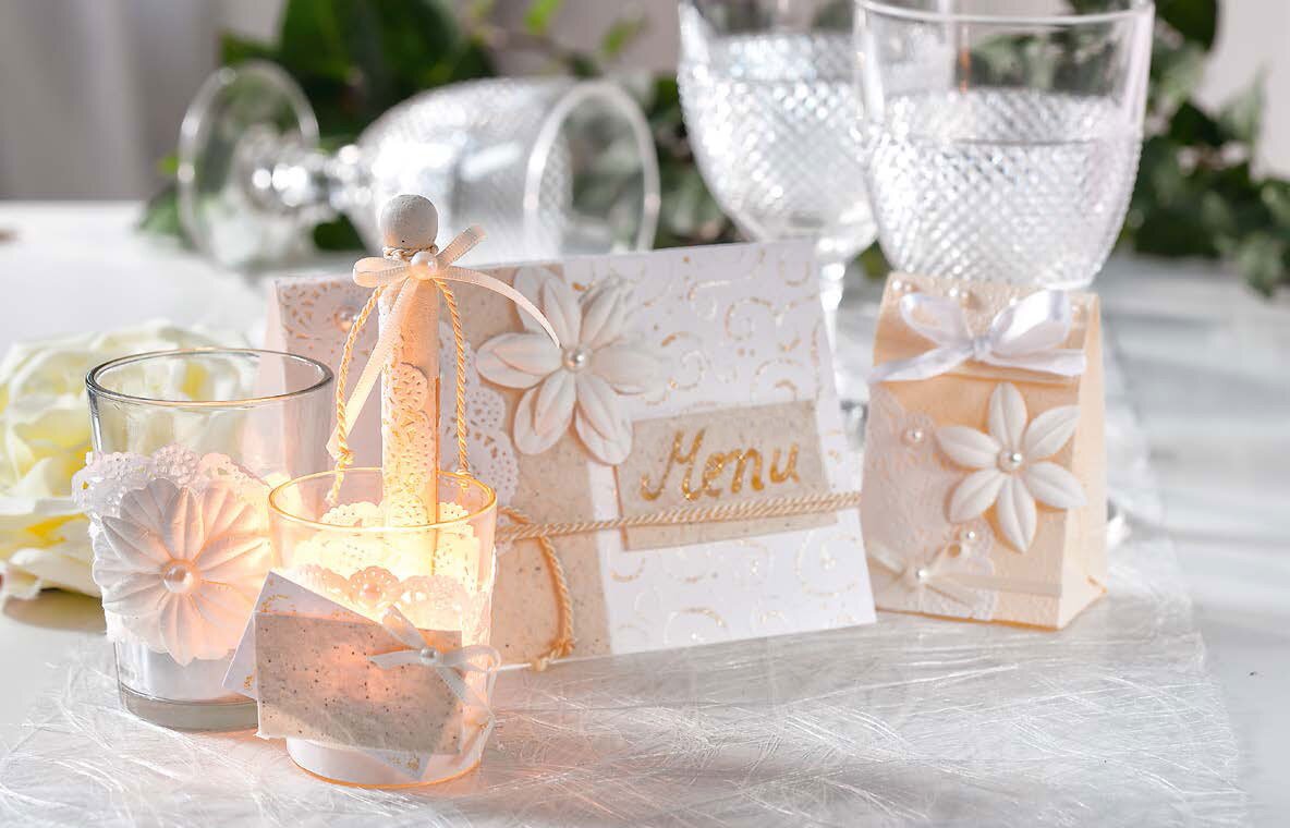 Für jeden echten Bastler ist es Ehrensache, dass die Tisch-Deko bei einer Hochzeit selbst gemacht ist. Hier ist alles in Creme und Weiß gehalten. Zu den eleganten Naturpapieren wird auf den Menue-Karten weißer Prägekarton kombiniert. Auch Serviettenringe, Give-Away-Tütchen und Teelichtgläser sind mit Spitzenpapier, Papierblüten und schimmernden Halbperlen gestaltet.