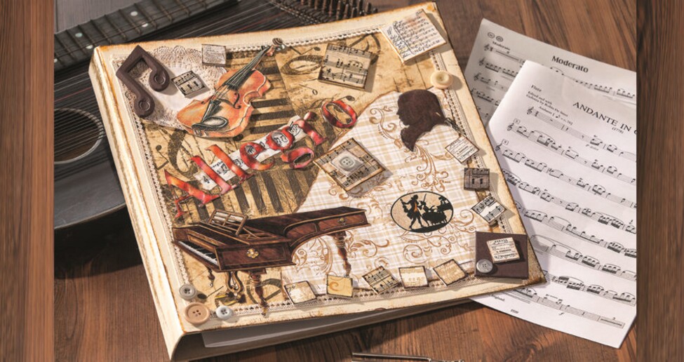 Appliquez une couche bien couvrante de peinture Ivoire sur l’extérieur du classeur et rehaussez ses arêtes en essuyant tour à tour sur celles-ci le coussin encreur Nougat et le coussin encreur Brun foncé. Débarrassez la serviette « Piano » de ses deux couches non imprimées et collez-la sur l’avant du classeur. Une fois sec, utilisez le Tape-Band pour fixer du ruban dentelle tout autour de la serviette. Déchirez un morceau de la feuille scrapbooking de votre choix issue du bloc de papier et tamponnez des fioritures sur celui-ci, essuyez les tampons encreurs sur ses bords et collez-le sur le classeur. Ensuite, découpez grossièrement des motifs de la feuille de découpage et de la serviette « Violon » et appliquez-les à l’aide de vernis pour serviette sur des feuilles de métal préalablement peintes en Blanc. Laissez bien sécher. Retracez les contours des motifs sur le verso de la feuille de métal, puis découpez les motifs et donnez-leur du relief en travaillant leur verso sur une plaque martyre. Essuyez très légèrement le tampon encreur sur le papier dentelle, peignez les lettres en MDF en Brun puis fixez-les sur le classeur. Complétez le collage par d’autres motifs et terminez par les motifs estampés. Décorez à votre guise les inchies et cartons entoilés avec de la peinture, des motifs de serviette et de feuille de découpage, rehaussez leurs contours avec de l’encre pour tampon puis collez le tout à chaud. Pour finir, agrémentez l’album de quelques boutons.