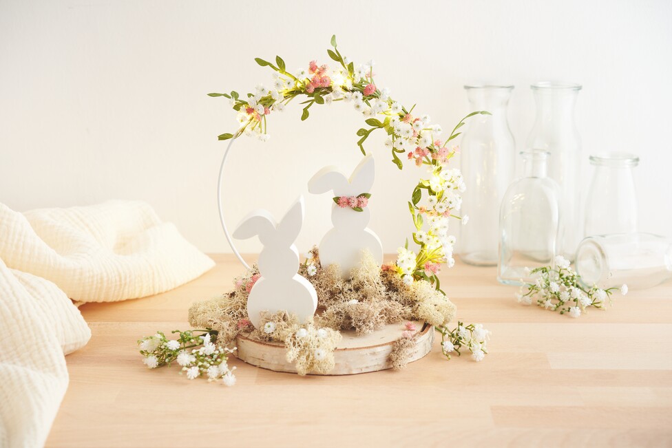 Collez une petite couronne de fleurs sur l'un des lapins et fixez solidement les deux moulages de lapin sur le disque de bouleau avec de la colle chaude. Enfin, vous pouvez coller de la mousse d'Islande et quelques fleurs supplémentaires sur le disque de bouleau pour accentuer l'aspect naturel de la composition.