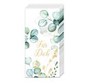 Tu es à la recherche d'un matériel de bricolage particulier pour égayer tes projets DIY ? Alors essaie les Mouchoirs en papier "Für Dich" (pour toi) ! Le motif avec des eucalyptus et l' inscription dorée "Pour toi" sur fond blanc n'est pas seulement joli à regarder, il peut aussi être utilisé de différentes manières.