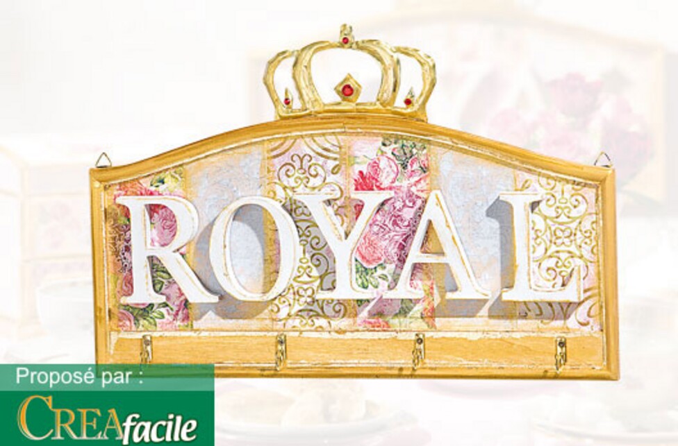 Tout un programme ! Surmonté d’une couronne en feuille d’aluminium dorée, ce panneau prend des allures royales. Plusieurs serviettes aux motifs assortis disposées en larges bandes constituent le fond du panneau.