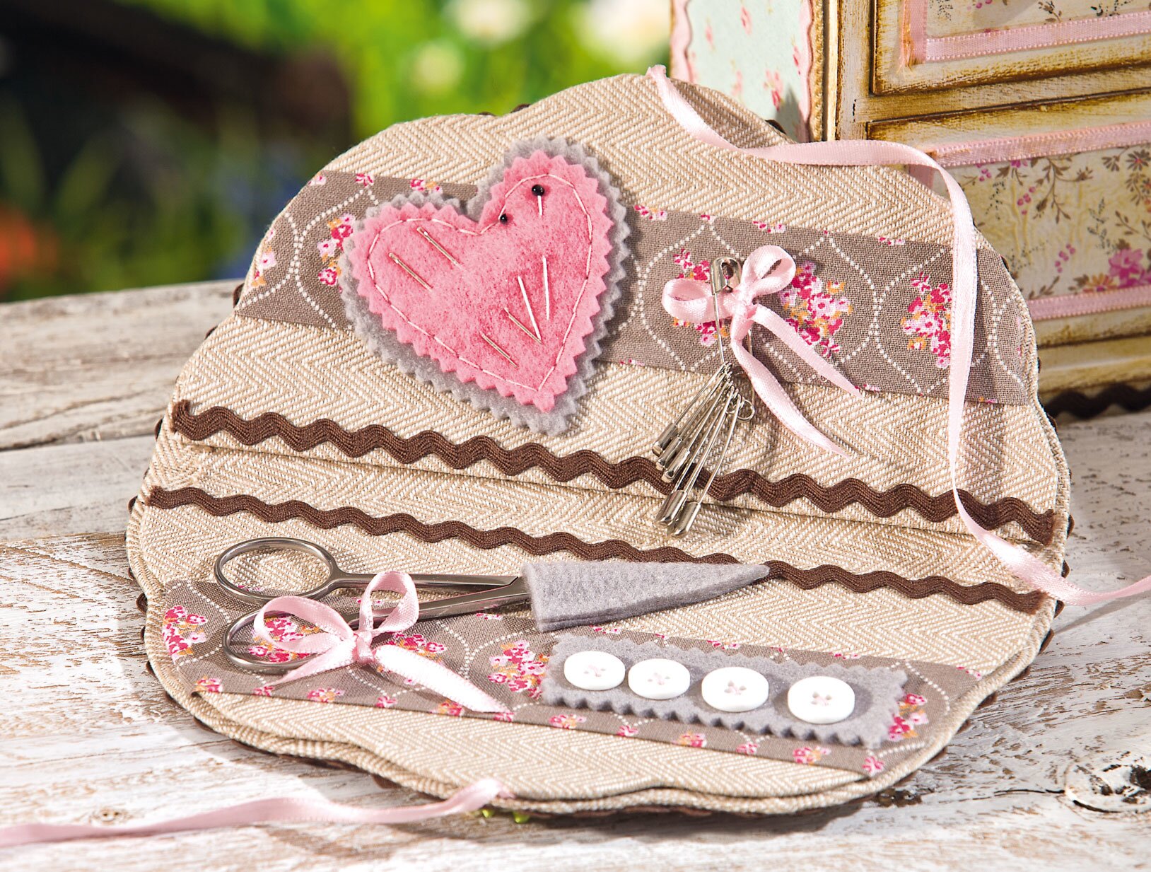 Pour l’intérieur de la trousse, taillez différentes formes dans de la feutrine – elles serviront à fixer vos aiguilles, épingles et boutons – et disposez-les à votre guise. Décorez de rubans zigzag, de dentelle et de petites roses en satin.