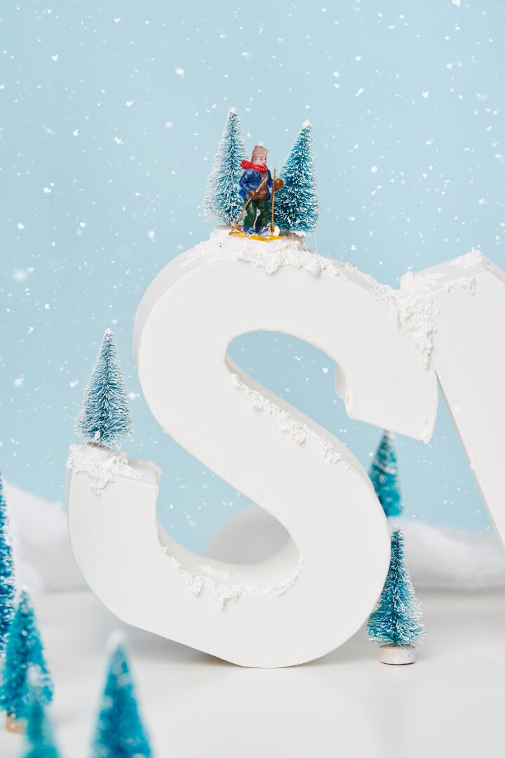 Peignez tout d'avord toutes les lettres avec de la peinture VBS Chalky Color. Tamponnez quelques sapins miniatures avec de la peinture, pour donner un effet enneigé.