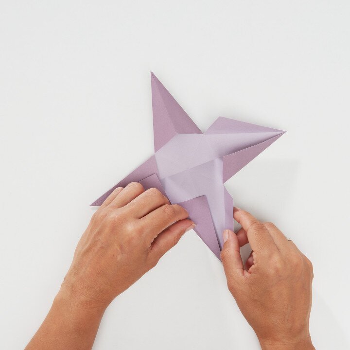 3. Fixiere auf der Rückseite des flachen Sterns einen weiteren 3D-Stern, sodass sich das Lämpchen genau in der Mitte der Sterne befindet