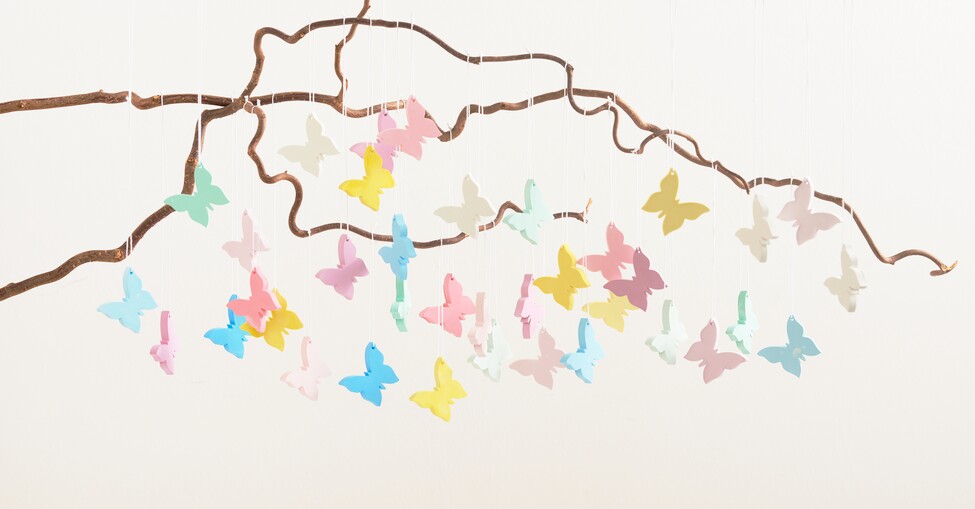 Fast geschafft! Fädele nun ein hübsches Band durch die vorgesehenen Löcher in den Schmetterlingsfiguren. Das Band dient als Aufhängung und ermöglicht es dir, die bunten Kunstwerke nach Belieben zu platzieren – ob im Zimmer, auf der Terrasse oder im Garten. Fertig!
