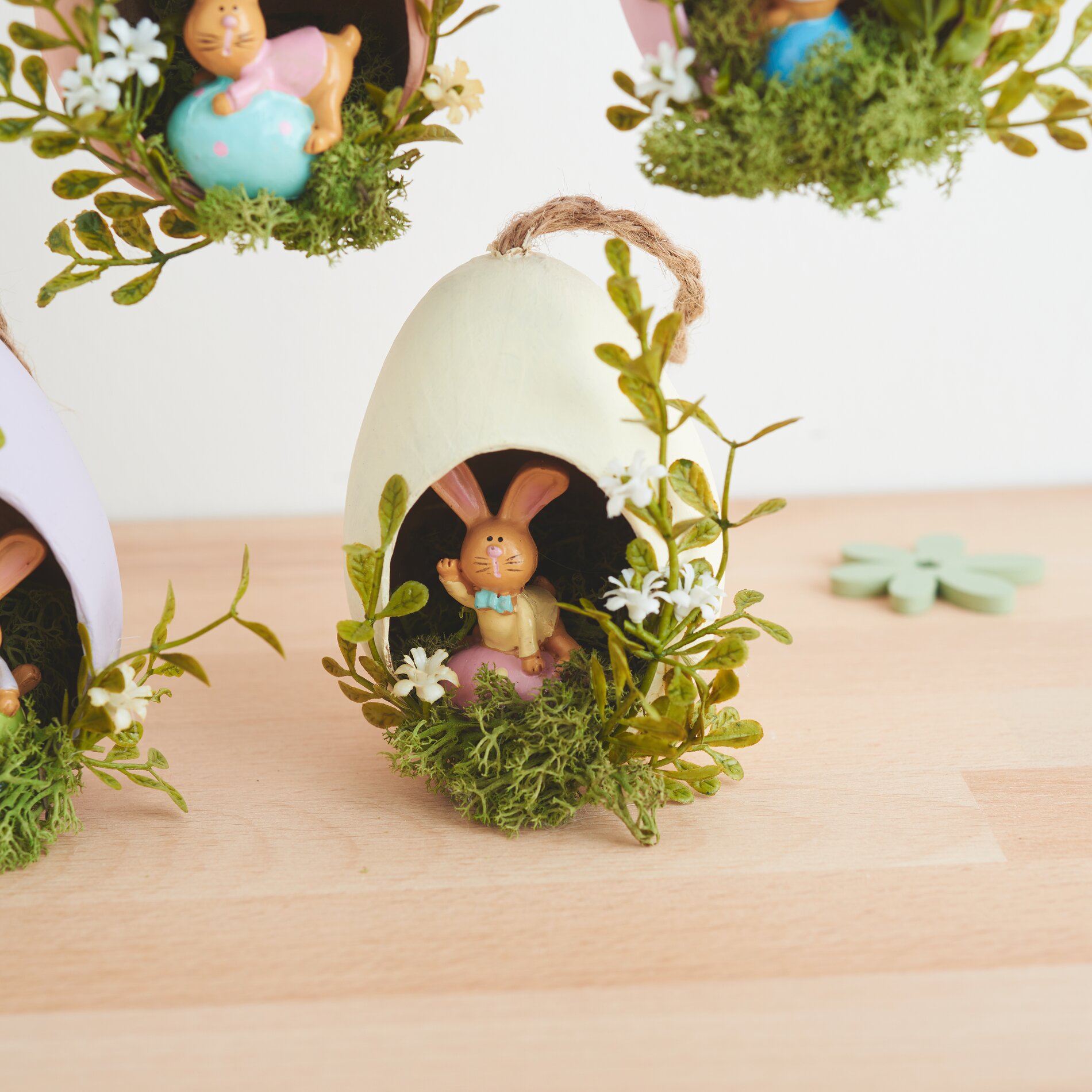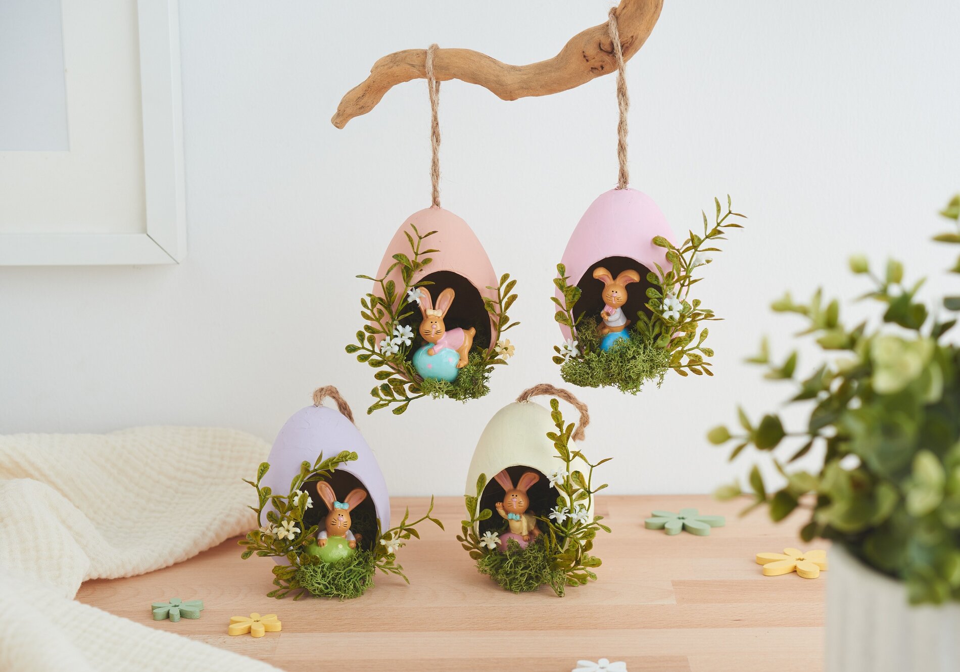 Sobald die Farbe getrocknet ist, klebst du mit Heißkleber etwas Moos in die Öffnung der Pappmaché-Eier und befestigst darauf die niedlichen VBS Hasen. Das Moos sorgt für eine natürliche Note und der Heißkleber garantiert einen sicheren Halt.