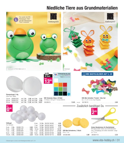 Niedliche Tiere aus Grundmaterialien Anleitung3205 VBS BASTELKLEBER AUF S. 24! Anleitung3207Styroporkugel, 2-tlg.Innen hohl. Teilbar.15 cm 30 600 224 ab 1 Stk. 2,80 ab 5 Stk. 2,5220 cm 30 600 231 ab 1 Stk. 5,10 ab 5 Stk. 4,5930 cm 30 613 392 ab 1 Stk. 11,85 ab 5 Stk. 10,67VBS Mini-Schleifen \Ca. L 3 x B 1,5 cm. Aus Polyester.30 139 12 2,80VBS Tonkarton-Block, 40 Blatt10 Farben. 220 g/m%u00b2. Format DIN A4.30 239 13 13,95 1m%u00b2=4,46b40 Blattnur1395Erl%u00e4uterungen zu Icons und Artikeleigenschaften auf S. 34 www.vbs-hobby.ch | 31Dekobeispiel mit POSCA Marker von S. 3. Dekobeispiel Zus%u00e4tzlich ben%u00f6tigst Du Kinder-Bastelschere f%u00fcr Rechtsh%u00e4nderMit abgerundeter Spitze und Zentimetereinteilung. Leichtg%u00e4ngig und solide verarbeitet. L%u00e4nge ca. 13 cm.30 520 713 2,35Nur235VBS Mal-Schw%u00e4mme, 3 St%u00fcck%u00d8 ca. 7 cm.30 330 350 5,90Ab080Hier wurden die VBS Wackelaugen %und VBS Wackelaugen \ verwendet.VollkugelAus Styropor.5 cm 1 Stk. 30 600 170 0,806 cm 1 Stk. 30 600 187 0,857 cm 1 Stk. 30 600 064 1,108 cm 1 Stk. 30 600 194 1,5510 cm 1 Stk. 30 600 200 2,256 cm 10 Stk. 30 616 140 06 4,957 cm 10 Stk. 30 616 140 07 6,208 cm 10 Stk. 30 616 140 08 7,7510 cm 10 Stk. 30 616 140 10 14,757 cm 50 Stk. 30 616 157 07 27,908 cm 50 Stk. 30 616 157 08 32,9510 cm 50 Stk. 30 616 157 10 62,95