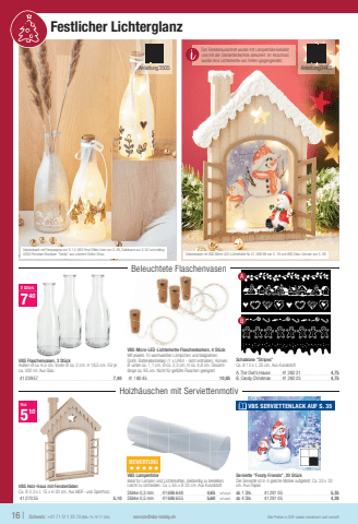 Dekobeispiel mit Pampasgras von S. 12, VBS Frost Effekt Liner von S. 49, Satinband von S. 52 und edding 4200 Porcelain Brushpen \VBS Micro-LED-Lichterkette Flaschenkorken, 4 St%u00fcckMit jeweils 10 warmwei%u00dfen L%u00e4mpchen und biegsamen Draht. Batteriebetrieben (1 x LR44 - nicht enthalten). Korken: %u00d8-unten ca. 1,1 cm, %u00d8 ca. 2,3 cm, H ca. 4,8 cm. Gesamtl%u00e4nge ca. 95 cm. Nicht f%u00fcr gef%u00fcllte Flaschen geeignet.41180 4510,85VBS Flaschenvasen, 3 St%u00fcckAu%u00dfen-%u00d8 ca. 6,5 cm. Innen-%u00d8 ca. 2 cm. H 18,5 cm. F%u00fcr je ca. 300 ml. Aus Glas.41239 577,40VBS Holz-Haus mit Fensterl%u00e4denCa. B 2,3 x L 15 x H 20 cm. Aus MDF- und Sperrholz.41270 355,10Schablone \Ca. B 12 x L 25 cm. Aus Kunststoff.A. The Owl's House41282 314,75B. Candy Christmas41282 254,75BEWERTUNGxxxxxVBS LampenfolieIdeal f%u00fcr Lampen und Lichterketten, beidseitig zu bekleben. Leicht zu schneiden. Ca. L 65 x B 33 cm. Aus Kunststoff.St%u00e4rke 0,3 mm41686 6484,651m%u00b2=21,63St%u00e4rke 0,5 mm41686 6555,601m%u00b2=26,05Serviette \Die Serviette ist in 4 gleiche Motive aufgeteilt. Ca. 33 x 33 cm. Aus Papier.ab 1 Stk.41281 055,35ab 4 Stk.41281 054,283 St%u00fcck740Nur51016 |Schweiz: +41 71 511 23 70 (Mo.-Fr. 9-17 Uhr)service@vbs-hobby.chAlle Preise in CHF sowie versteuert und verzolltADekobeispiel mit VBS Micro-LED-Lichterkette Nr. 41 268 88 von S. 18 und VBS Deko-Schnee von S. 49.Anleitung3466 Festlicher Lichterglanz Beleuchtete Flaschenvasen Holzh%u00e4uschen mit Serviettenmotiv VBS SERVIETTENLACK AUF S. 35 BDer Fensterausschnitt wurde mit Lampenfolie beklebt und mit der Serviettentechnik dekoriert. Im Anschluss wurde eine Lichterkette von hinten gegengeklebt.Anleitung3505