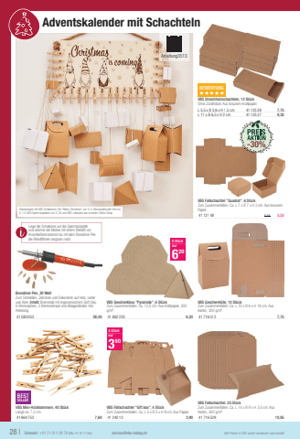 Dekobeispiel mit VBS Schablonen-Set \S. 13, VBS Sperrholzplatten von S. 24 und VBS Juteband aus unserem Online-Shop.Brandmal-Pen, 30 WattZum Schreiben, Zeichnen und Dekorieren auf Holz, Leder und Kork. Inhalt: Brennstab mit ergonomischem Soft Grip, 6 Brennspitzen, 3 Brennstempel und Ablagest%u00e4nder. Inkl. Anleitung.41580 05228,40BESTSELLERVBS Mini-Holzklammern, 40 St%u00fcckL%u00e4nge ca. 7,2 cm.41664 7527,60VBS Geschenkt%u00fcte, 10 St%u00fcckZum Zusammenfalten. Ca. L 10 x B 6 x H 16 cm. Aus Karton, 300 g/m%u00b2.41716 5127,75VBS Geschenkbox \Zum Zusammenfalten. Ca. 12,5 cm. Aus Kraftpapier, 300 g/m%u00b2.41862 2336,20VBS Faltschachtel \Zum Zusammenfalten. Ca. L 7 x B 7 x H 3 cm. Aus braunem Papier.41121 485,103,55VBS Faltschachtel \Zum Zusammenfalten. Ca. L 5 x B 5 x H 8 cm. Aus Pappe.41240 133,90VBS Faltschachtel, 25 St%u00fcckZum Zusammenfalten. Ca. L 14 x B 9 x H 3,5 cm. Aus Karton, 300 g/m%u00b2.41716 52910,85BEWERTUNGxxxxxVBS Streichholzschachteln, 12 St%u00fcckOhne Z%u00fcndh%u00f6lzer. Aus braunem Kraftpapier.L 5,5 x B 3,6 x H 1,5 cm41125 287,75L 11 x B 6,5 x H 2 cm41125 279,306 St%u00fccknur6204 St%u00fccknur39028 |Schweiz: +41 71 511 23 70 (Mo.-Fr. 9-17 Uhr)service@vbs-hobby.chAlle Preise in CHF sowie versteuert und verzollt Adventskalender mit Schachteln -30%Anleitung3513Lege die Schablone auf die Sperrholzplatte und zeichne die Motive mit einem Bleistift vor. Anschlie%u00dfend brennst du mit dem Brandmal-Pen die Bleistiftlinien langsam nach.