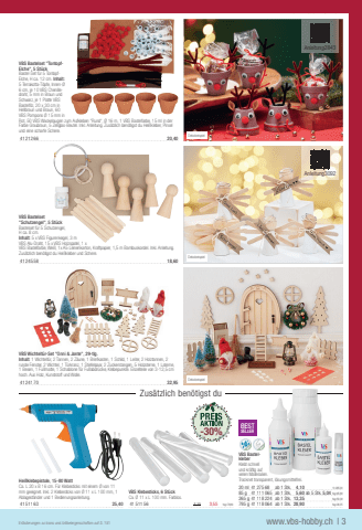 Hei%u00dfklebepistole, 15-80 WattCa. L 20 x B 16 cm. F%u00fcr Klebesticks mit einem %u00d8 von 11 mm geeignet. Inkl. 2 Klebesticks von %u00d8 11 x L 100 mm, 1 Ablagest%u00e4nder und 1 Bedienungsanleitung.41511 6325,40VBS Bastelset \Elche\Bastel-Set f%u00fcr 5 TontopfElche, H ca. 12 cm. Inhalt:5 Terrakotta-T%u00f6pfe, Innen-%u00d8 6 cm, je 10 VBS Chenilledraht, 5 mm in Braun und Schwarz, je 1 Platte VBS Bastelfi lz, 20 x 30 cm in Hellbraun und Braun, 60 VBS Pompons %u00d8 15 mm in Rot, 50 VBS Wackelaugen zum Aufkleben \Farbe Graubraun, 5 Zellglas-Beutel. Inkl. Anleitung. Zus%u00e4tzlich ben%u00f6tigst du Hei%u00dfkleber, Pinsel und eine scharfe Schere.41212 6620,40VBS Bastelset \, 5 St%u00fcckBastelset f%u00fcr 5 Schutzengel, H ca. 8 cm.Inhalt: 5 x VBS Figurenkegel, 3 m VBS Alu-Draht, 15 x VBS Holzspatel, 1 x VBS Bastelfarbe, Wei%u00df, 1x A5 Leinenkarton, Kraftpapier, 1,5 m Bambuskordel. Inkl. Anleitung. Zus%u00e4tzlich ben%u00f6tigst du Hei%u00dfkleber und Schere.41245 5818,60VBS Wichtelt%u00fcr-Set \Inhalt: 1 Wichtelt%u00fcr, 2 Tannen, 2 Z%u00e4une, 1 Briefkasten, 1 Schild, 1 Leiter, 2 Holztannen, 2 runde Fenster, 2 Wichtel, 1 T%u00fcrkranz, 1 Stiefelpaar, 2 Zuckerstangen, 5 Holzsterne, 1 Laterne, 1 Besen, 1 Fu%u00dfmatte, 1 Schablone f%u00fcr Fu%u00dfabdr%u00fccke, Klebepunkte. Einzelteile von 3-12,5 cm hoch. Aus Holz, Kunststoff und Wolle.41241 7032,95BESTSELLERVBS BastelkleberKlebt schnell und kr%u00e4ftig auf vielen Materialien. Trocknet transparent, l%u00f6sungsmittelfrei.20 ml41275 68ab 1 Stk.4,101l=205,0085 g41111 065ab 1 Stk.5,60ab 5 Stk.5,041kg=65,88265 g41118 224ab 1 Stk.13,351kg=50,38795 g41118 064ab 1 Stk.28,901kg=36,35WeihnachtsweltErl%u00e4uterungen zu Icons und Artikeleigenschaften auf S. 181www.vbs-hobby.ch| 3Zus%u00e4tzlich ben%u00f6tigst du DekobeispielAnleitung2843DekobeispielDekobeispielAnleitung3092VBS Klebesticks, 6 St%u00fcckCa. %u00d8 11 x L 100 mm. Farblos.41511 565,103,551kg=78,89-30%