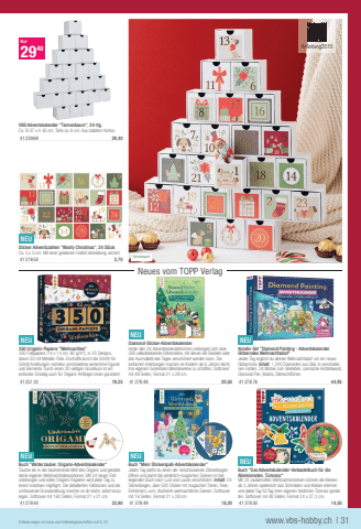 VBS Adventskalender \Ca. B 37 x H 45 cm, Tiefe ca. 6 cm. Aus stabilem Karton.41239 6929,40NEUSticker Adventszahlen \Ca. 5 x 5 cm. Mit einer goldenem Hotfoil Veredelung verziert.41276 503,70NEU350 Origami-Papiere \350 Faltpapiere (14 x 14 cm, 80 g/m%u00b2), in 25 Designs, davon 50 mit Metallic-Folie. Erschaffe durch die Schritt-f%u00fcrSchritt Anleitungen m%u00fchelos verschiedene winterliche Figuren und Elemente. Durch einen 20-seitigen Grundkurs ist ein einfacher Einstieg auch f%u00fcr Origami-Anf%u00e4nger:innen garantiert.41251 3219,25NEUDiamond-Sticker-AdventskalenderHinter den 24 Adventskalendert%u00fcrchen verbergen sich %u00fcber 350 selbstklebende Glitzersteine, mit denen die Bastelei oder das Ausmalbild des Tages versch%u00f6nert werden kann. Die einfachen Anleitungen machen es Kindern ab 6 Jahren leicht, ihre eigenen funkelnden Meisterwerke zu schaffen. Softcover mit 48 Seiten, Format 21 x 28 cm.41278 4820,50NEUKreativ-Set \Glitzerndes Weihnachtsdorf\Jeden Tag erg%u00e4nzt du deinen Weihnachtsdorf um ein neues Glitzermotiv. Inhalt: 1.200 Diamanten aus Glas in verschiedenen Farben, 24 Motive zum Bekleben, szenische Aufstellwand, Diamond Pen, Wachs, Steinschiffchen.41278 7644,95NEUBuch \Tauche ein in die faszinierende Welt des Origami und gestalte deine eigenen Weihnachtsdekorationen. Mit 24 neuen Faltanleitungen und edlen Origami-Papieren wird jeder Tag zu einem kreativen Highlight. Die detaillierten Faltskizzen und die umfassende Grundanleitung machen es dir leicht, sofort loszulegen. Softcover mit 160 Seiten, Format 21 x 21 cm.41278 4023,90NEUBuch \Jeden Tag darfst du einen der verschlossenen Stickerbogen %u00f6ffnen und damit die winterlich-magischen Szenen im beiliegenden Buch nach Lust und Laune versch%u00f6nern. Inhalt: 24 Stickerbogen, %u00fcber 500 Sticker mit magischen Tieren, Feen, Einh%u00f6rnern, uvm, illustrierte weihnachtliche Szenen. Softcover mit 16 Seiten, Format 21 x 28 cm.41278 4918,20NEUBuch \Allerkleinsten. T%u00fcrkranz\Mit 24 zauberhaften Weihnachtsmotiven k%u00f6nnen die Kleinen ab 3 Jahren spielerisch das Schneiden und Kleben erlernen und dabei Tag f%u00fct Tag ihren eigenen festlichen T%u00fcrkranz gestalten. Softcover mit 48 Seiten, Format 24 x 27,3 cm.41278 5014,50Nur2940Erl%u00e4uterungen zu Icons und Artikeleigenschaften auf S. 57www.vbs-hobby.ch| 31Dekobeispiel Neues vom TOPP Verlag Anleitung3515