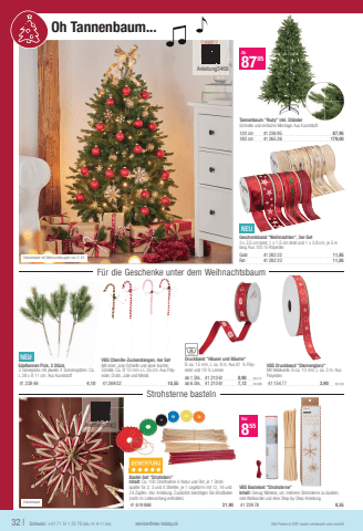 Dekobeispiel mit Weihnachtskugeln von S. 43.Tannenbaum \Schnelle und einfache Montage. Aus Kunststoff.120 cm41236 9587,95180 cm41265 26179,00NEUGeschenkband \3 x 2,5 cm breit, 1 x 1,5 cm breit und 1 x 3,8 cm, je 5 m lang. Aus 100 % Polyester.Gold41282 2211,85Rot41282 2311,85BEWERTUNGxxxxxBastel-Set \Inhalt: Ca. 100 Strohhalme in Natur und Rot, je 1 Strohspalter f%u00fcr 2, 3 und 4 Streifen, je 1 Legeform mit 12, 16 und 24 Zapfen. Inkl. Anleitung. Zus%u00e4tzlich ben%u00f6tigen Sie Bindfaden (nicht im Lieferumfang enthalten).41619 86821,90VBS Bastelset \Inhalt: Genug Material, um mehrere Strohsterne zu basteln, rote Wollkordel und eine Step-by-Step-Anleitung.41239 788,55Ab8795Nur85532 |Schweiz: +41 71 511 23 70 (Mo.-Fr. 9-17 Uhr)service@vbs-hobby.chAlle Preise in CHF sowie versteuert und verzollt Oh Tannenbaum... Druckband \B. ca. 15 mm, L ca. 8 m. Aus 81 % Polyester und 19 % Leinen.ab 1 Stk.41210 618,901m=1,11ab 6 Stk.41210 617,121m=0,89VBS Chenille-Zuckerstangen, 4er SetMit einer Jute-Schleife und einer bunten Schelle. Ca. %u00d8 10 mm x L 35 cm. Aus Polyester, Draht, Jute und Metall.41269 3210,55NEUEdeltannen Pick, 3 St%u00fcck3 Tannepicks mit jeweils 4 Tannenspitzen. Ca. L 28 x B 11 cm. Aus Kunststoff.41238 464,10VBS Druckband \Mit Webkante. B ca. 10 mm, L ca. 3 m. Aus Polyester.41154 773,901m=1,30Dekobeispiel F%u00fcr die Geschenke unter dem Weihnachtsbaum Strohsterne basteln Anleitung3468Anleitung2662BEWERTUNGxxxxx