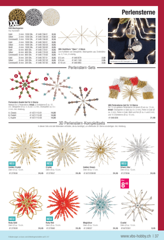 VBS WachsperlenAus Kunststoff.Gold3 mm1250 Stk.41640 756 018,55Silber3 mm1250 Stk.41640 756 028,55Cremewei%u00df3 mm1250 Stk.41640 756 828,55Gold4 mm1000 Stk.41640 763 018,85Silber4 mm1000 Stk.41640 763 028,85Wei%u00df4 mm1000 Stk.41640 763 828,85Gold6 mm600 Stk.41640 770 018,85Silber6 mm600 Stk.41640 770 028,85Cremewei%u00df6 mm600 Stk.41640 770 828,85Gold8 mm320 Stk.41640 787 018,85Silber8 mm320 Stk.41640 787 028,85Cremewei%u00df8 mm320 Stk.41640 787 828,85Perlenstern-Bastel-Set f%u00fcr 5 SterneMaterial f%u00fcr 5 Perlensterne. Inhalt: 5 Drahtsterne %u00d8 ca. 10 cm, Dekoperlen %u00d8 ca. 4, 6 und 7,5 mm, Olivenperlen ca. 6 x 3 mm. Inkl. Anleitung.A. Classic41672 115 0114,80B. Pastell41672 115 0214,80C. Kupfer41672 115 0314,80VBS Drahtform \Zum Auff%u00e4deln von Dekoperlen, Wachsperlen usw. Drahtst%u00e4rke ca. 0,7 mm, 8-strahlig.%u00d8 5 cm41640 8792,50%u00d8 8 cm41641 1592,95%u00d8 10 cm41640 8933,55VBS Perlensterne-Set f%u00fcr 10 SterneF%u00fcr 10 rot-goldene Perlensterne mit einem %u00d8 von ca. 10 cm. Inhalt: Olivenperlen in Gold (ca. 6 x 3 mm), Perlen in Gold (%u00d8 ca. 3 mm), Perlen in Gold, Wei%u00df und Rot (%u00d8 ca. 4 und 8 mm) und 10 Drahtsterne (%u00d8 ca. 10 cm).41646 82621,90Erl%u00e4uterungen zu Icons und Artikeleigenschaften auf S. 57www.vbs-hobby.ch| 37NEUGolden CrystalStern-%u00d8 ca. 15 cm.41278 5824,45NEUCrystalStern-%u00d8 ca. 15 cm.41278 5724,45Golden DreamStern-%u00d8 ca. 17 cm.41672 238 0224,45NEUSilvern StarStern-%u00d8 ca. 15 cm.41278 5624,45NEURuby GoldStern-%u00d8 ca. 15 cm.41278 5924,45NEURuby RedStern-%u00d8 ca. 15 cm.41278 6024,45MagicblueStern-%u00d8 ca. 15 cm.41248 3724,45CrystalStern-%u00d8 ca. 12 cm.41672 3518,45Nur845 Perlenstern-Sets 3D Perlenstern-Komplettsets In diesen Sets sind alle Materialien enthalten, die du ben%u00f6tigst, um effektvolle 3D-Sterne anzufertigen. Inkl. Anleitung.ADekobeispiel mit VBS Glaskugeln von S. 43Perlensterne CB