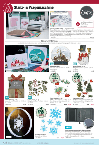 Sizzix Big Shot Plus White & Gray \Endlose M%u00f6glichkeiten%u00a0im Bereich Heim Dekor, Patchwork, Applikationen, Papiergestaltung, Verzierung von Kleidung und vielem mehr! Inhalt: 1 Sizzix Big Shot Maschine ca. 40 x 29,8 x 19 cm, 1 Paar Schneideplatten A4, 1 Plus Plattform und 1 Plus Adapter f%u00fcr d%u00fcnne Stanzformen, 19 Thinlits Stanzschablonen, 1 Pr%u00e4geschablone, 20 Kartonb%u00f6gen DIN A4, 20 hochwertige Kreativpapier DIN A4, 1 Bedienungsanleitung.41213 06299,00Schneefl ocken, 6-tlg.Motivgr%u00f6%u00dfe ca. 1,8-6 cm.41155 5115,509,30Sizzix Aufbewahrungsmappe f%u00fcr StanzschablonenMit Tragegriff und Rei%u00dfverschluss. Mit Stoff bezogen. Im Inneren befi nden sich elastische Riemen, 1 Magnetfolie von 21 x 30 cm, 5 graue Plastikeins%u00e4tze mit Klettverschluss (3 von 22 x 15 cm und 2 von 22 x 30 cm).41134 19452,9542 |Schweiz: +41 71 511 23 70 (Mo.-Fr. 9-17 Uhr)service@vbs-hobby.chAlle Preise in CHF sowie versteuert und verzolltNEUGift Card Package, 6-tlg.Motivgr%u00f6%u00dfe: 1,59 cm x 4,45 cm - 12,07 cm x 11,43 cm.41282 5039,95NEUWinston Colorize, 16-tlg.Motivgr%u00f6%u00dfe: 0,32 cm x 0,32 cm - 7,30 cm x 8,89 cm.41282 5244,95Pencil Line Holly, 17-tlg.Inhalt: 5 Stanzschablonen aus Metall und 12 Clear Stamps aus Silikon. Motivgr%u00f6%u00dfe: 3,2 x 4,1 cm - 9,5 x 9,2 cm.41250 6734,9526,90NEUSnowglobe, 26 tlg.Motivgr%u00f6%u00dfe: 0,32 cm x 0,32 cm - 11,43 cm x 9,53 cm41282 5124,45NEUHoliday Greens, 11-tlg.Motivgr%u00f6%u00dfe: 0,95 cm x 1,91 cm - 7,62 cm x 4,13 cm.41282 4926,90Pine Holidays, 19-tlg.Inhalt: 8 Stanzschablonen aus Metall und 11 Clear Stamps aus Silikon. Motivgr%u00f6%u00dfe: 2,9 x 2,9 cm - 12,1 x 7,9 cm.41250 6834,9526,9019 Stanzschablonen und 1 Pr%u00e4geschablone sind im Lieferumfang enthalten.DekobeispielDekobeispiel Stanz- & Pr%u00e4gemaschine -21%-21% Stanzschablonen Aus Metall. Mit allen herk%u00f6mmlichen Stanz- und Pr%u00e4gemaschinen f%u00fcr den Hobbybereich geeignet. Nicht geeignet f%u00fcr Kinder unter 3 Jahren.-40%- zum Pr%u00e4gen und Stanzen- bis DIN A4- sicherer Stand- viel Zubeh%u00f6r