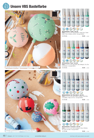 VBS Bastelfarbe \Inhalt: Je 20 ml in der Farbe Wei%u00df, Gelb, Mittelgr%u00fcn, Rot, Blau und Schwarz. L%u00f6sungsmittelfrei.41275 5420,201l=168,33VBS Bastelfarbe \Inhalt: Je 20 ml in der Farbe Elfenbein, Pastell-Rosa, PastellViolett, Puder, Antikblau und Mint. L%u00f6sungsmittelfrei.41275 5520,201l=168,33VBS Bastelfarben-Set \Inhalt: Je 20 ml in der Farbe Eisblau, Antikblau, Marineblau, Lavendelblau, Beige und Grau. L%u00f6sungsmittelfrei.41275 5820,201l=168,33VBS Bastelfarbe \Inhalt: Je 20 ml in der Farbe Dunkelgr%u00fcn, Braun, Elfenbein, Rot, Gold und Silber. L%u00f6sungsmittelfrei.41275 5620,951l=174,5846 |Schweiz: +41 71 511 23 70 (Mo.-Fr. 9-17 Uhr)service@vbs-hobby.chAlle Preise in CHF sowie versteuert und verzollt Unsere VBS Bastelfarbe Dekobeispiel mit Kunststoffkugeln mit Stutzen und Buchenrundst%u00e4ben aus unserem Online-Shop.Dekobeispiel mit Styroporkugel-Set Art.-Nr. 41 615 755 aus unserem Online-Shop.Anleitung3541Anleitung3542