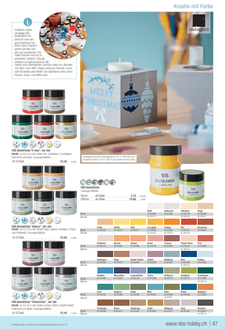 VBS Bastelfarbe\Inhalt: Je 50 ml in der Farbe Rot, Graubraun, Dunkelgr%u00fcn, Karminrot und Gold. L%u00f6sungsmittelfrei.41275 6023,401l=93,60VBS Bastelfarbe \Inhalt: Je 50 ml in der Farbe Puder, Apricot, Antikgr%u00fcn, Khaki und Antikwei%u00df. L%u00f6sungsmittelfrei.41275 6323,401l=93,60VBS Bastelfarbe \Inhalt: Je 50 ml in der Farbe Fuchsia, Beere, Pastell-Violett, Antikros%u00e9 und Silber. L%u00f6sungsmittelfrei.41275 6523,401l=93,60Kreativ mit FarbeErl%u00e4uterungen zu Icons und Artikeleigenschaften auf S. 57www.vbs-hobby.ch| 47Dekobeispiel mit VBS Teelichtw%u00fcrfeln Art.-Nr. 41 695 954 und Schablonen-Set Art.-Nr. 41 256 75 aus unserem Online-Shop.Wei%u00dfAntikwei%u00dfElfenbeinBeige50 ml41274 8841274 9241274 7641274 69230 ml41275 1741275 1241275 11PuderVanilleGelbCurrygelbOrangeRotKarminrot50 ml41275 0741274 7941274 7741274 9541274 8241275 0141274 91230 ml41275 1841275 1541275 19Antikros%u00e9ApricotAltrosaBeereFuchsiaPastell-RosaPink50 ml41274 7441274 6541274 6641274 7041274 8541275 0341274 96230 ml-----41275 20-AubergineFeigePastell-ViolettViolettAntikblauBlauEisblau50 ml41274 6841274 7841274 8441274 9341274 6741274 8041274 94230 ml41275 13HellblauMarineblauLavendelblauT%u00fcrkisAntikgr%u00fcnApfelgr%u00fcnDunkelgr%u00fcn50 ml41274 9841275 0541275 1041275 0841274 7341274 7541274 86230 ml41275 16Gr%u00fcnHellgr%u00fcnKhakiMintOlivePetrolRotbraun50 ml41274 9741274 9941275 0041275 0441275 0941275 0641275 02230 ml41275 21TerrakottaBraunGraubraunOckerAntikgrauGrauSchwarz50 ml41274 8941274 7241274 8741274 9041274 7141274 8341274 81230 ml------41275 14VBS BastelfarbeL%u00f6sungsmittelfrei.50 mlJe Farbe5,101l=102,00230 mlJe Farbe18,601l=80,87+HOHOEntdecke unsere vielseitige VBS Bastelfarbe! Sie bietet dir eine sehr gute Deckkraft, hat einen hohen Pigmentgehalt und l%u00e4sst sich sehr gut verstreichen. Die Farbe trocknet matt auf, ist wasserfest, lichtecht, l%u00f6sungsmittelfrei und geruchsneutral. Alle Farben sind untereinander mischbar. Ideal zum Bemalen von Stein, Holz, MDF, Papier, Leinwand, Keramik, Kunststoff, Terrakotta oder Metall. Die Oberfl %u00e4che sollte vorher trocken, staub- und fettfrei sein!Anleitung3543